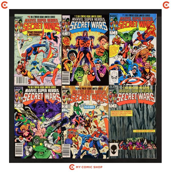 Issues 1N, 2, 3N, 4, 5N, 6N, 7, 9N, 10, 11, and 12N of Marvel Super Heroes Secret Wars (1984). Most will grade in the FN range with a few grading VG.