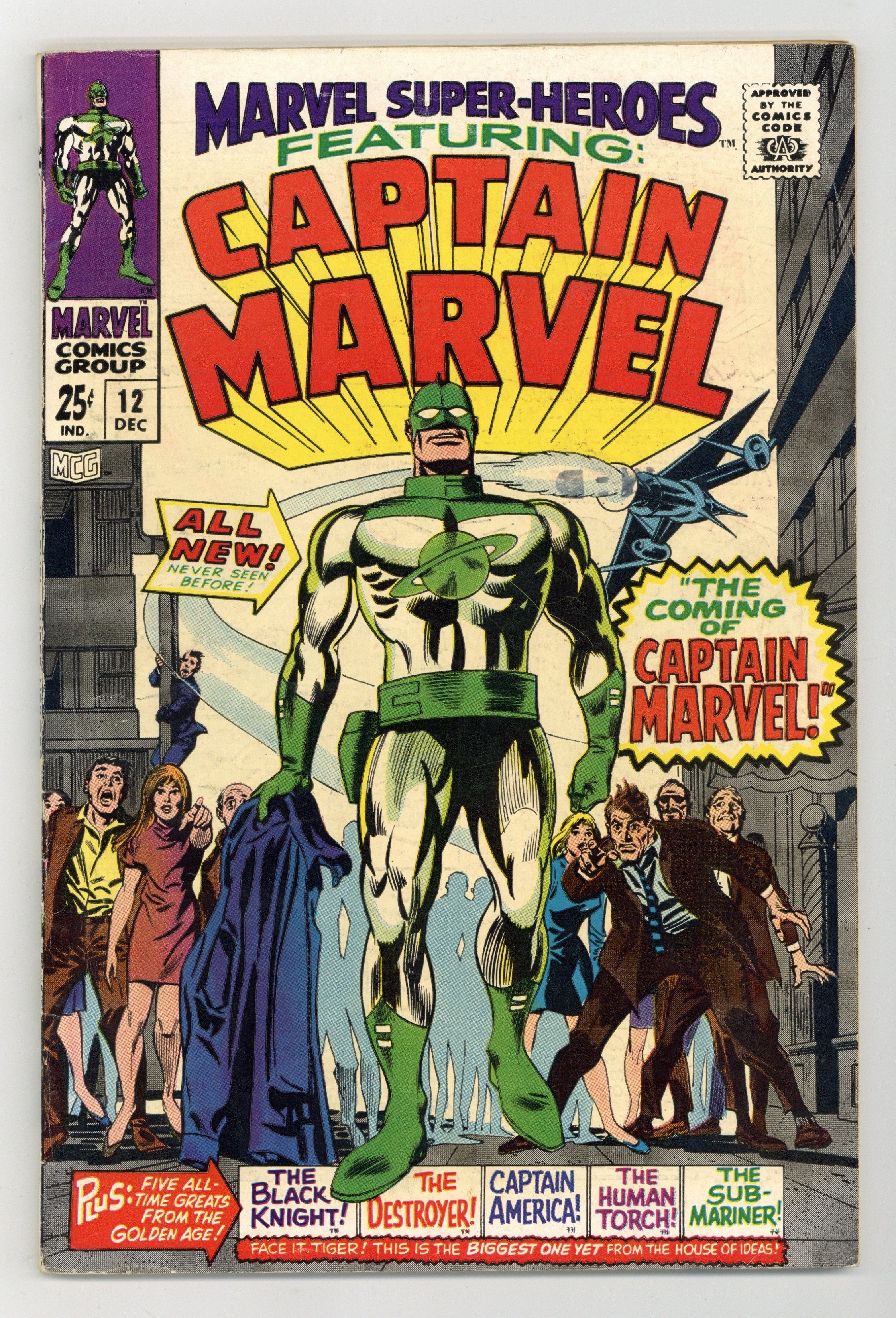 Starts Apr 20 Giant-size issue. Series continues from Fantasy Masterpieces. Origin and first appearance of Captain Marvel in "The Coming of Captain Marvel!" Script by Stan Lee, pencils by Gene Colan, inks by Frank Giacoia. The rest of the issue consists of Golden Age reprints: Captain America (from Men's Adventures # 28; 1954); the Human Torch by Dick Ayers (from Men's Adventures # 27; 1954); the Destroyer (from All Winners # 12; 1944); the Black Knight by Stan Lee and Joe Maneely (from Black Knight # 1; 1955); and the Sub-Mariner by Bill Everett (from Sub-Mariner # 38; 1955). Colan cover pencils. Cover price $0.25.
