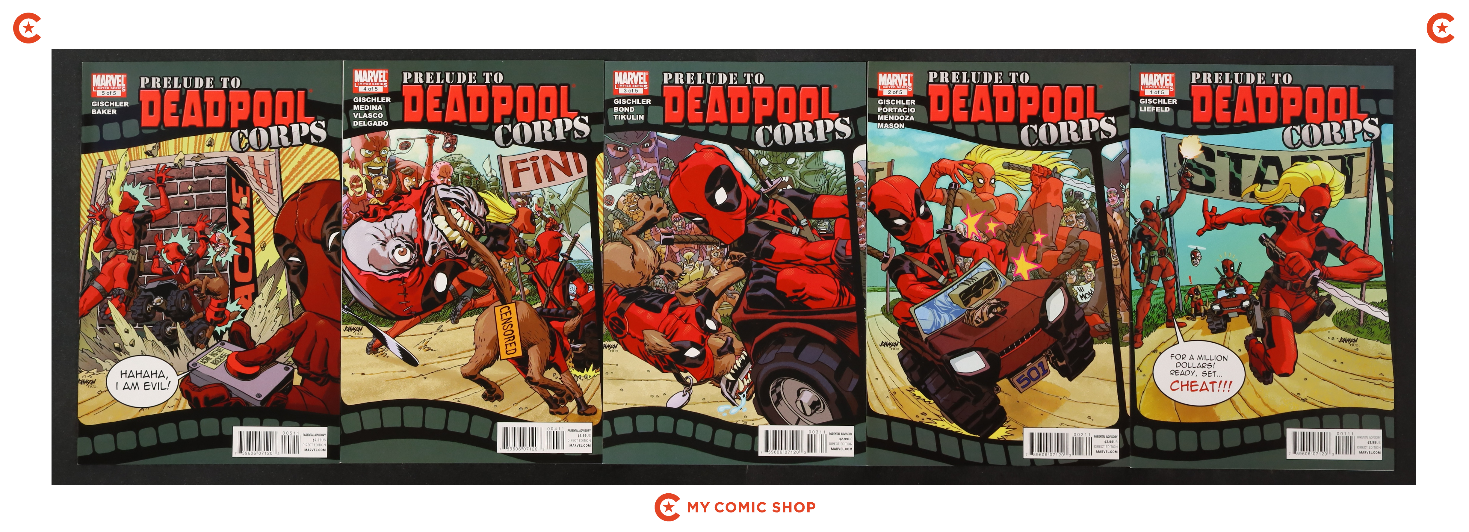 Issues 1A, 2, 3, 4, 5 of Prelude to Deadpool Corps (2010), and issue 1 of Deadpool Corps Rank and Foul (2010). Most will grade in the FN to VF range.
