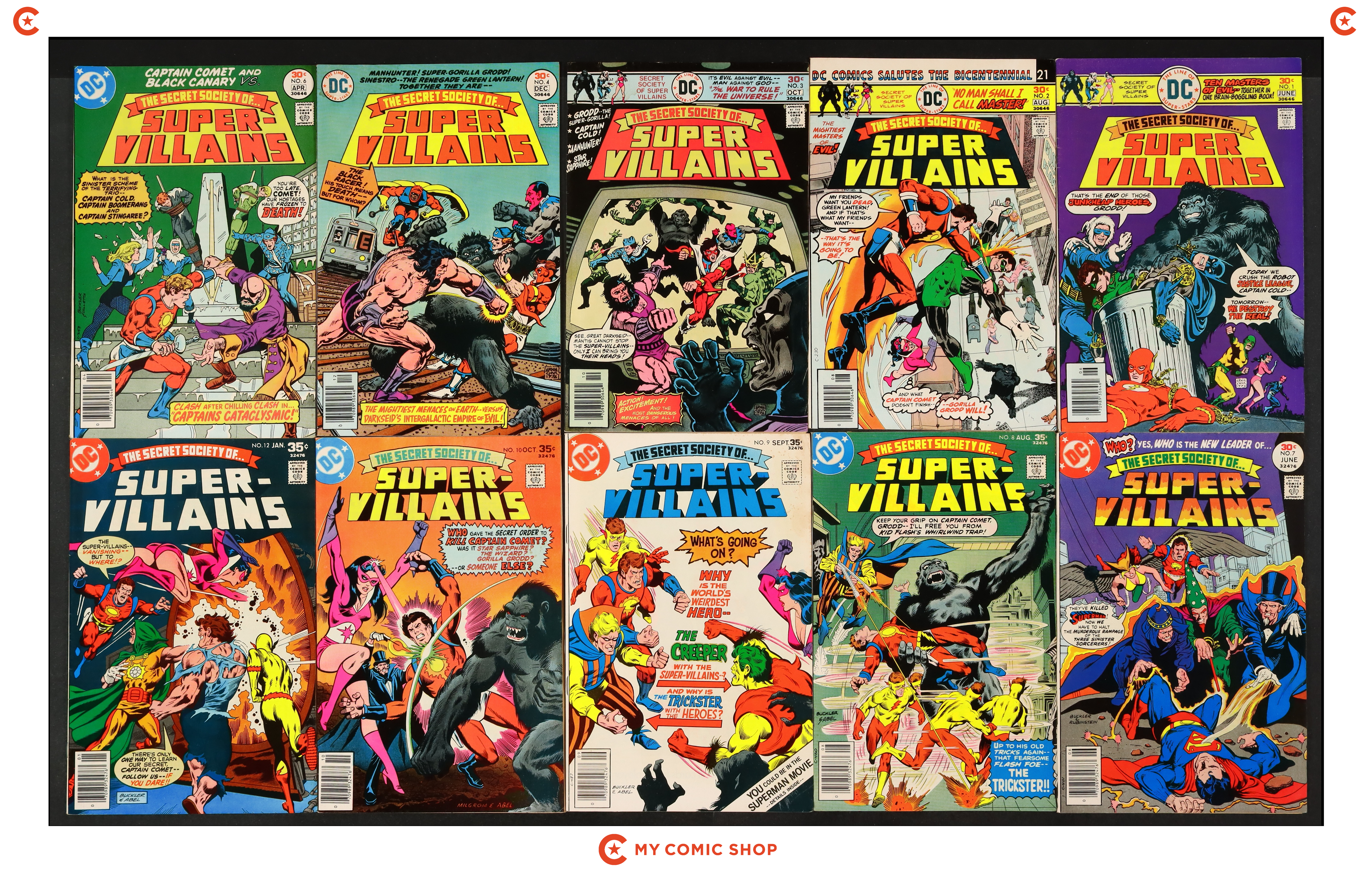 Issues 1, 2, 3, 4, 6, 7, 8, 9, 10, and 12 of Secret Society of Super Villains (1976). Most will grade int he VG to FN range.
