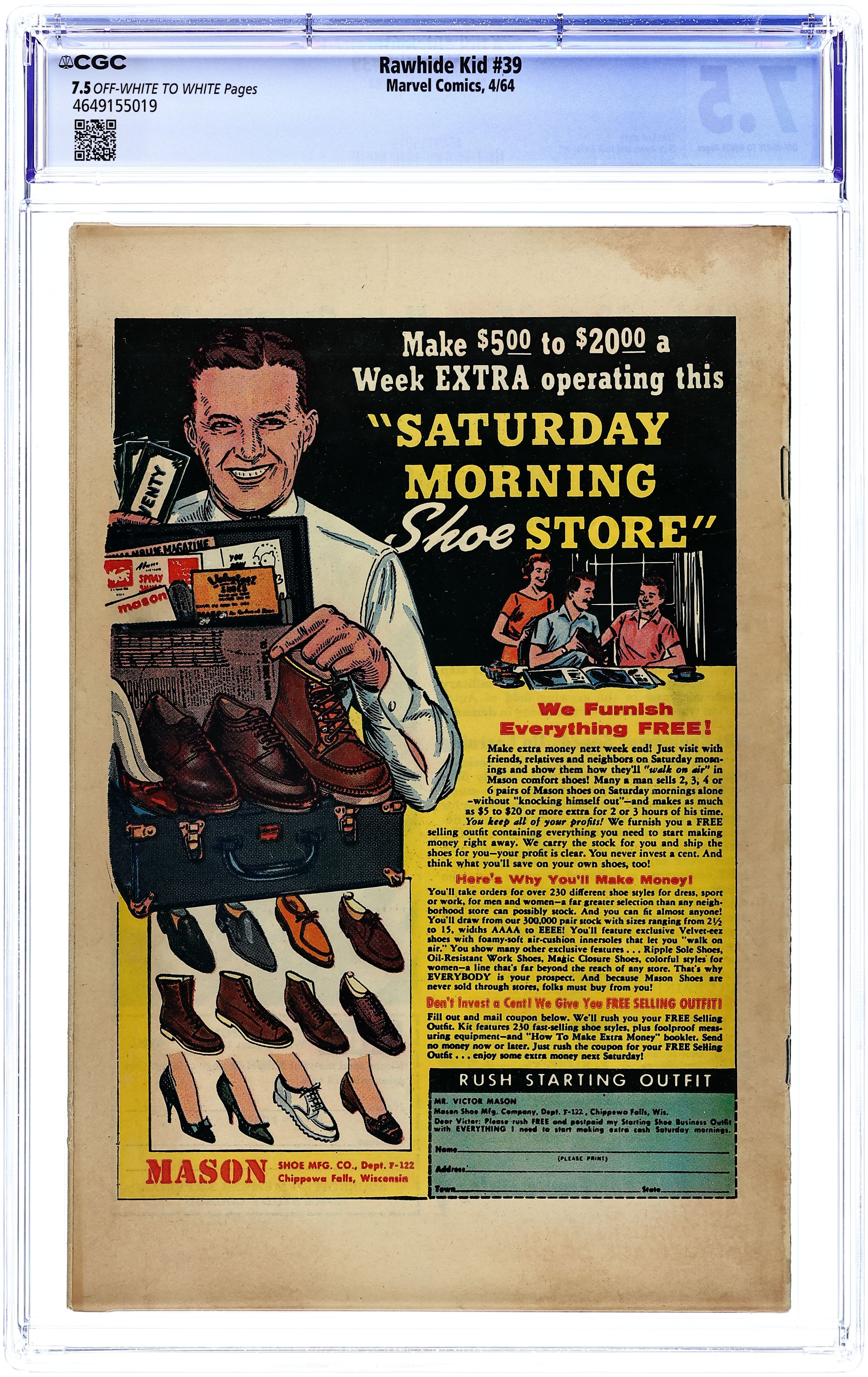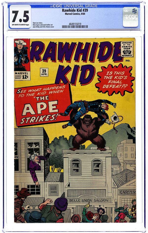 Starts Jan 3 Cover by Jack Kirby and Chic Stone. Stories by Stan Lee. Art by Dick Ayers and Jack Keller. Is this the Rawhide Kid's final defeat? See what happens to the Kid when..."The Ape Strikes!" by Stan Lee and Dick Ayers. Also in this issue: Back-up story "The Frightened Man" by Lee and Jack Keller. Plus: A boy grows up to be a loner because of taunts, but when he sees another youth with a similar problem in danger he reaches out and finds the acceptance of the community in the 2-page text story "The Loners," reprinted from Apache Kid (1950) #15. 32 pages, full color. Cover price $0.12.