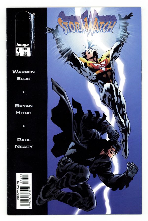 Starts Apr 20 A Finer World: Part 1 of 3 - Written by Warren Ellis. Art by and cover Bryan Hitch and Paul Neary. StormWatch Black – a special unit of StormWatch that officially doesnt exist – discovered a deadly plot by International Operations to conduct biological war-games. Heading to Pavane, Louisiana the team began their investigation, despite the fact that the American government had forbid them from operating on U.S. soil. Exerting diplomatic pressure on France, Weatherman Jackson King was able to coerce its Prime Minister to invoke code perfect, the loophole that allows StormWatch to land and protect endangered citizens in any foreign territory. However, during the battle that ensued, StormWatch learned the secret identity of the man who helped facilitate the entire deadly chemical exercise – the mad ex-StormWatch Weatherman, Henry Bendix! 32 pages, FC. NOTE: 1st appearance of Apollo and The Midnighter. Cover price $2.50.