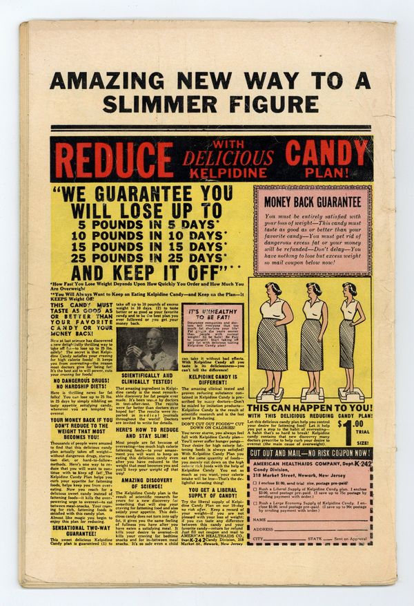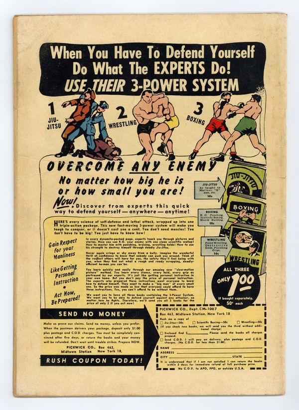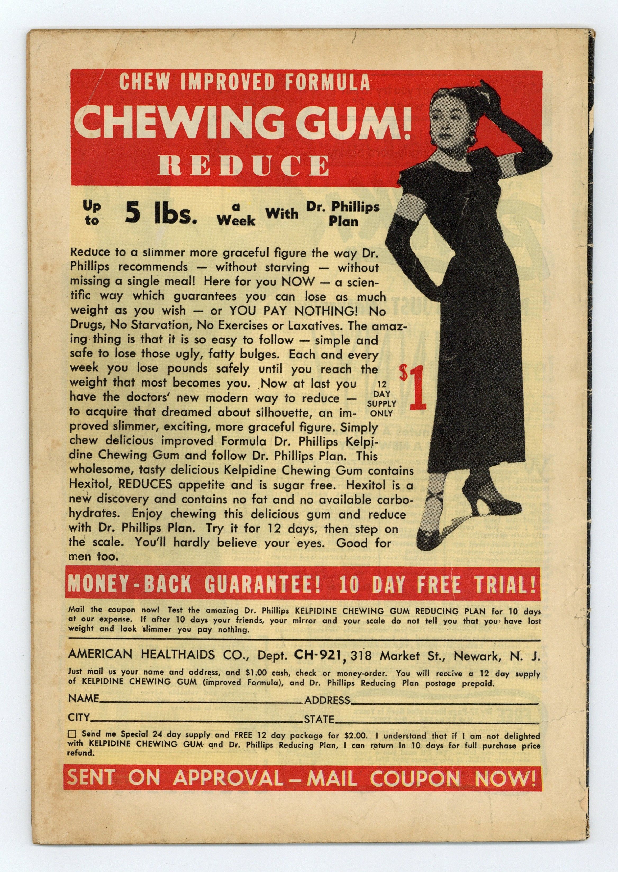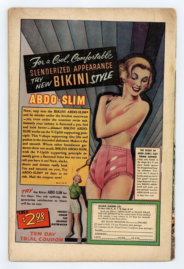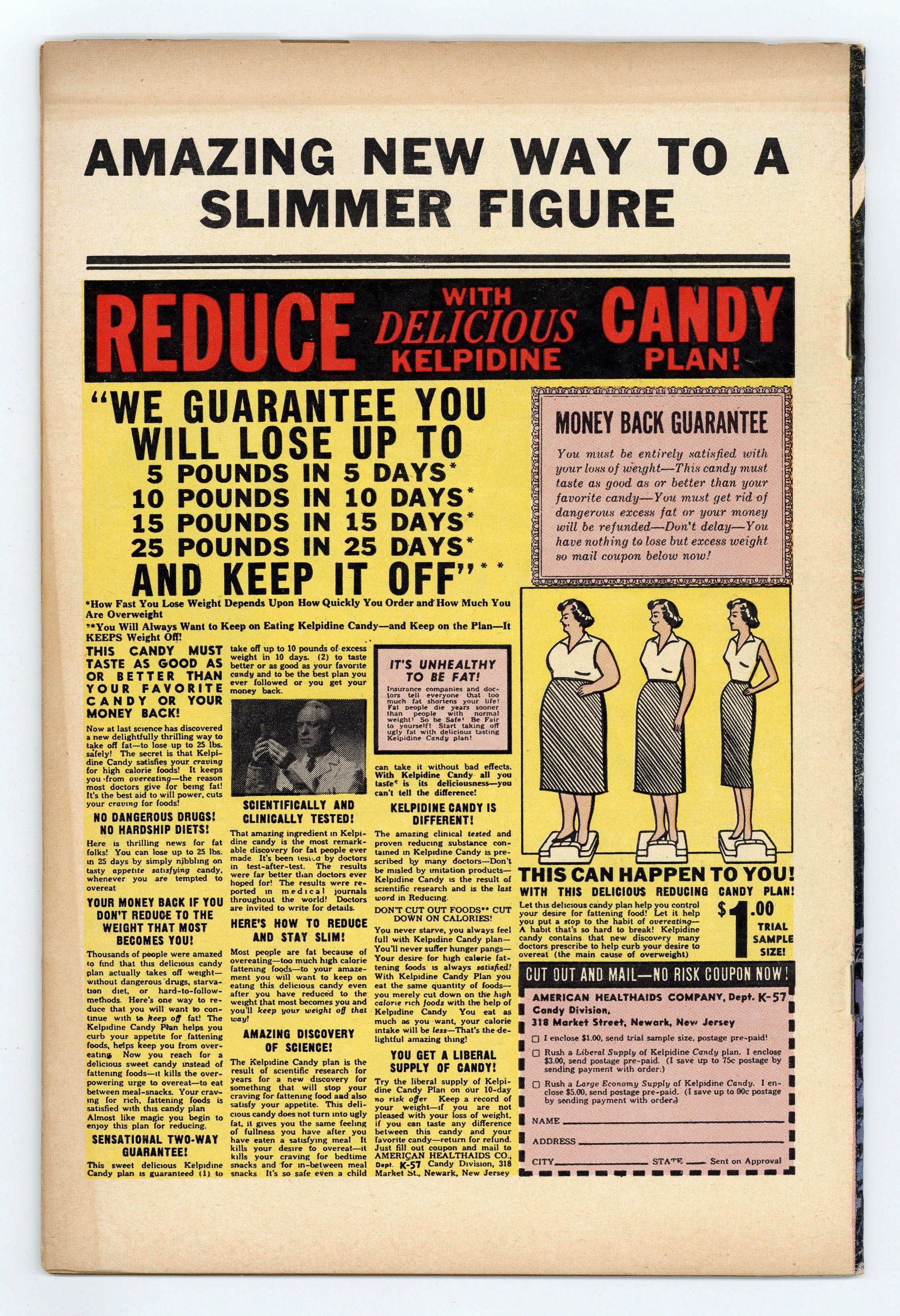 Starts Apr 4 Cover art by Bill Everett. "Mary and the Witch!", art by Bernie Krigstein; A woman who used to act on the stage is impressed with a magician's ability to seem to perform real magic; She pretends to be interested in him until he takes her to meet his mother, who he claims is a witch and the true source of his power. "The Phantom Flivver" text story. "The Last Word," art by Larry Woromay; A man cheats on his wife until she cuts him off; When his lover admits she only paid attention to him for his money, he loses his temper and kills her; He begs his wife for money so he can leave the country but she doesn't respond. "Don't Look Down," art by George Roussos; A man has a perception of being at great heights when he is only sitting on furniture; A psychologist attempts to cure him by tipping over his chair, but the fall shatters his body. "Afraid!", art by Sam Kweskin; Frankenstein's monster spooks himself by reading his favorite horror literature. "He Walked Thru the Wall," pencils by Vic Dowling, inks by Bob Stuart; A crook steals a scientist's salve which allows the molecules of his body to pass through walls but it wears off as he is passing through the bank's wall. 36 pgs., full color. Cover price $0.10.