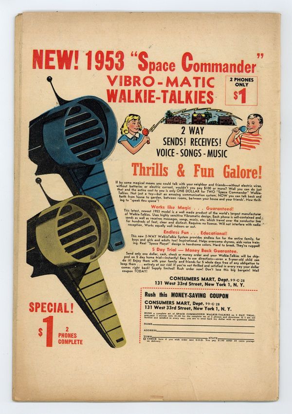 Starts Apr 4 Cover art by Russ Heath. "The Man Who Couldn't Be Punished," art by Fred Kida; In 1990 prisons have been done away with as wasteful by the machines that run things; Instead, criminals are subject to a process which ages them one year for every second they endure it. "He Swallowed It Up!", art by Gene Colan; Two sword swallowers duel for the title of King of the Sword Swallowers; One attempts to poison the sword of the other, but the intended victim thwarts his ploy by swallowing the sword with its scabbard on. "The Invaders" text story. "Wilbur!", art by Sid Greene; When a lawyer tells a man his rich relative has left some money to Wilber whom he brought back from Africa, the man heads into the dark downstairs with a knife intending to do away with Wilber and collect the full inheritance. "Keep Your Eye on Junior," pencils by Ed Moline, inks by Sheldon Moldoff; A governess is given responsibility over an unruly child who attempts to damage a construct in the attic which contains tiny people; She takes a hatchet away from him, but he threatens to tell his mother. "The World I Lost!", art by John Forte; This unusual two-part story is concluded next issue; In the setup, an atomic scientist who dreads nuclear war resolves to build a time machine in order to visit the year 2053 and determine if the worst takes place. 36 pgs., full color. Cover price $0.10.