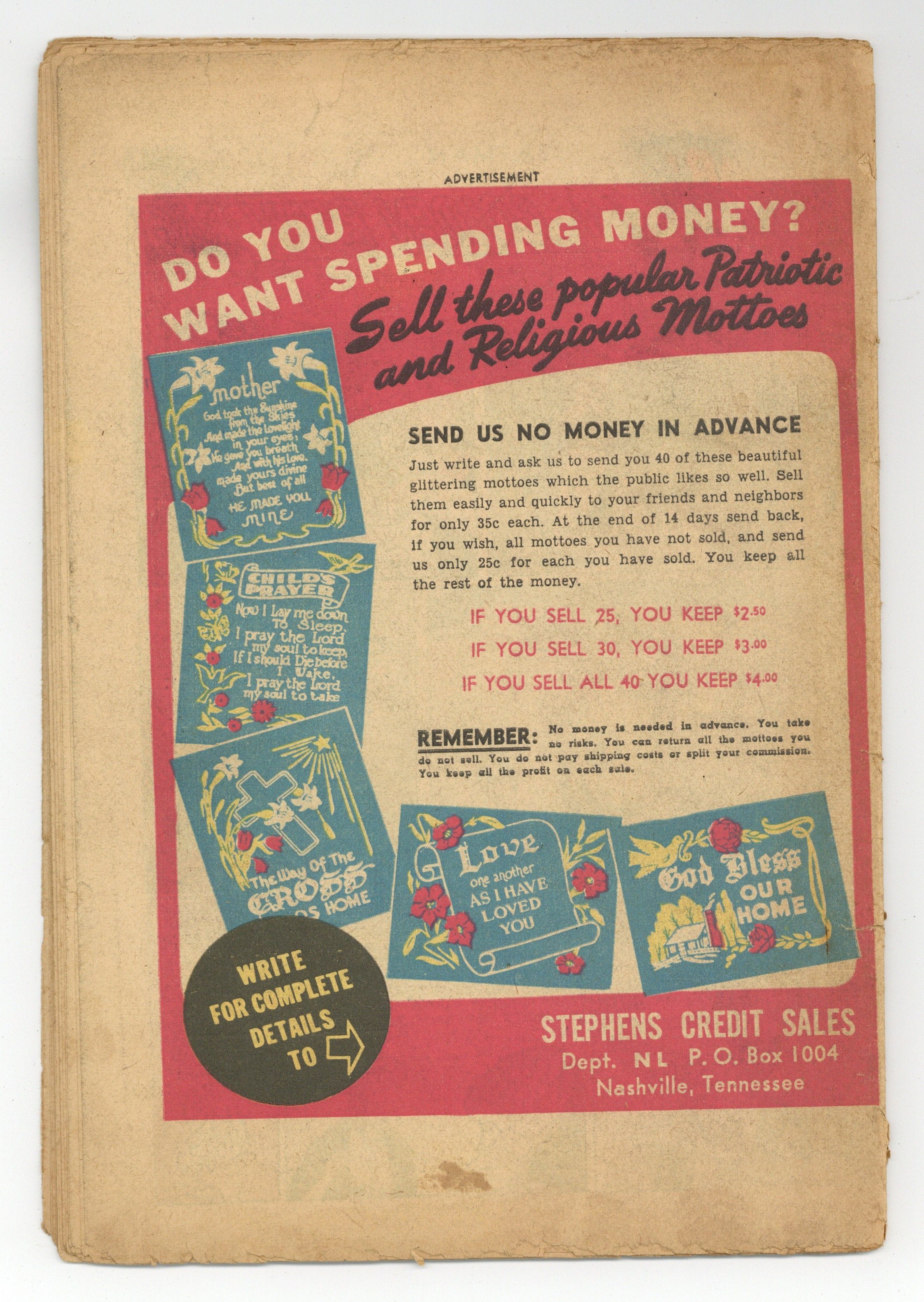 Starts Dec 22 Cover art by Sheldon Moldoff. Your United Nations at Work public service announcement. "The Great Clayface - Joker Feud," script by Bill Finger, pencils by Sheldon Moldoff, inks by Charles Paris; After escaping from prison, Matt Hagen finds a way to synthesize the liquid that turns him into Clayface, and once more takes up crime; The Joker, meanwhile, objects to Clayface getting all the headlines, so he starts a feud with Clayface. True Crime Laffs humor/nonfiction page by Henry Boltinoff. "The Boyhood of Bruce Wayne Jr.," script by Bill Finger, pencils by Sheldon Moldoff, inks by Charles Paris; Robin II takes after his father and is able to help Batman by discovering the secret escape method employed by the Green Owl Gang. 36 Pages, Full Color. Cover price $0.12.