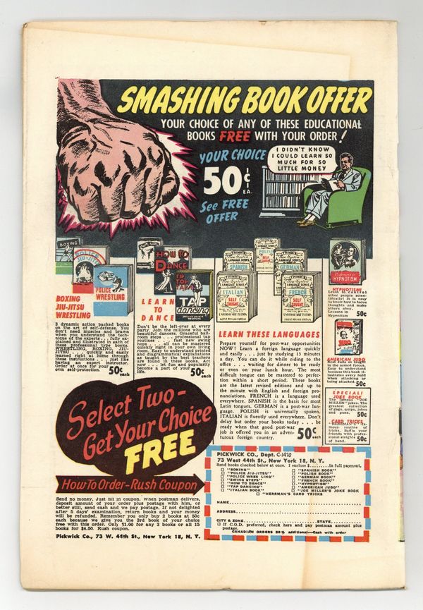 Starts Apr 20 Cover by Ed Moritz. Stories and art by Joe Orlando, Leo Morey, Fred Bell, Henry Kiefer and Ed Moritz. Violent, offbeat pre-Code crime comics from D.S. Publishing Company. An outlaw gang springs its leader from his trial just before sentencing, in a bit of ultra-violent gunplay. Marie is so cold-blooded, she murders a dozen people just to test out her new poison. A mysterious burglar uses a drill and never lets anyone see his face. Plus an early story by legendary artist Joe Orlando. Massacre in the Courtroom; Blood Money; East Meets Test; The Case of the Giggling Killer; Quitter; The Beauty with the Heart of a Snake; Driller. 52 pages, Full Color. Cover price $0.10.