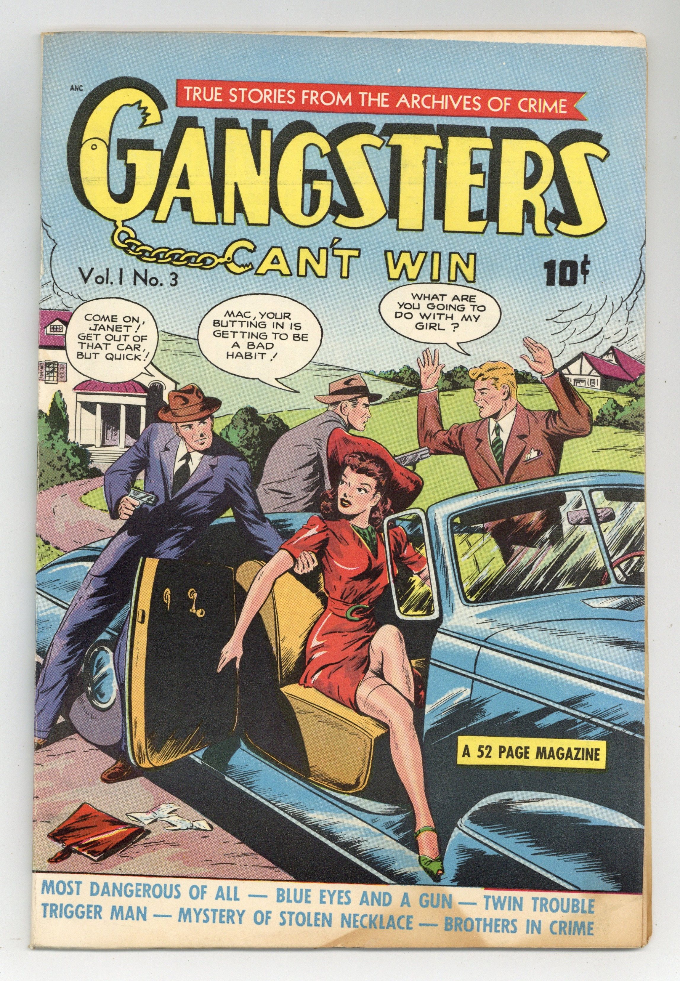 Starts Apr 4 Stories and art by Leo Morey and others. Starting as a brutal pre-Code true-crime comic in its early issues, Gangsters Cant Win later evolved into a standard mystery-detective title. Ma Barker and her sons become the first family of crime, until the Feds catch up with them. Beautiful Stella Irwin joins her husband Benny for a spree of bank robberies. Twin brothers Dan and Don Olson both grow up in a bad neighborhood, but one turns to crime and the other becomes a lawman. Most Dangerous Of All; Blue Eyes and a Gun: The Story of Stella Irwin; Twin Trouble; Thunder on the Mountain; Trigger Man: The Story of Frankie Uale; The Mystery of the Stolen Necklace; The Incredible Ma Barker; Brothers In Crime. 52 pages, Full Color. Cover price $0.10.