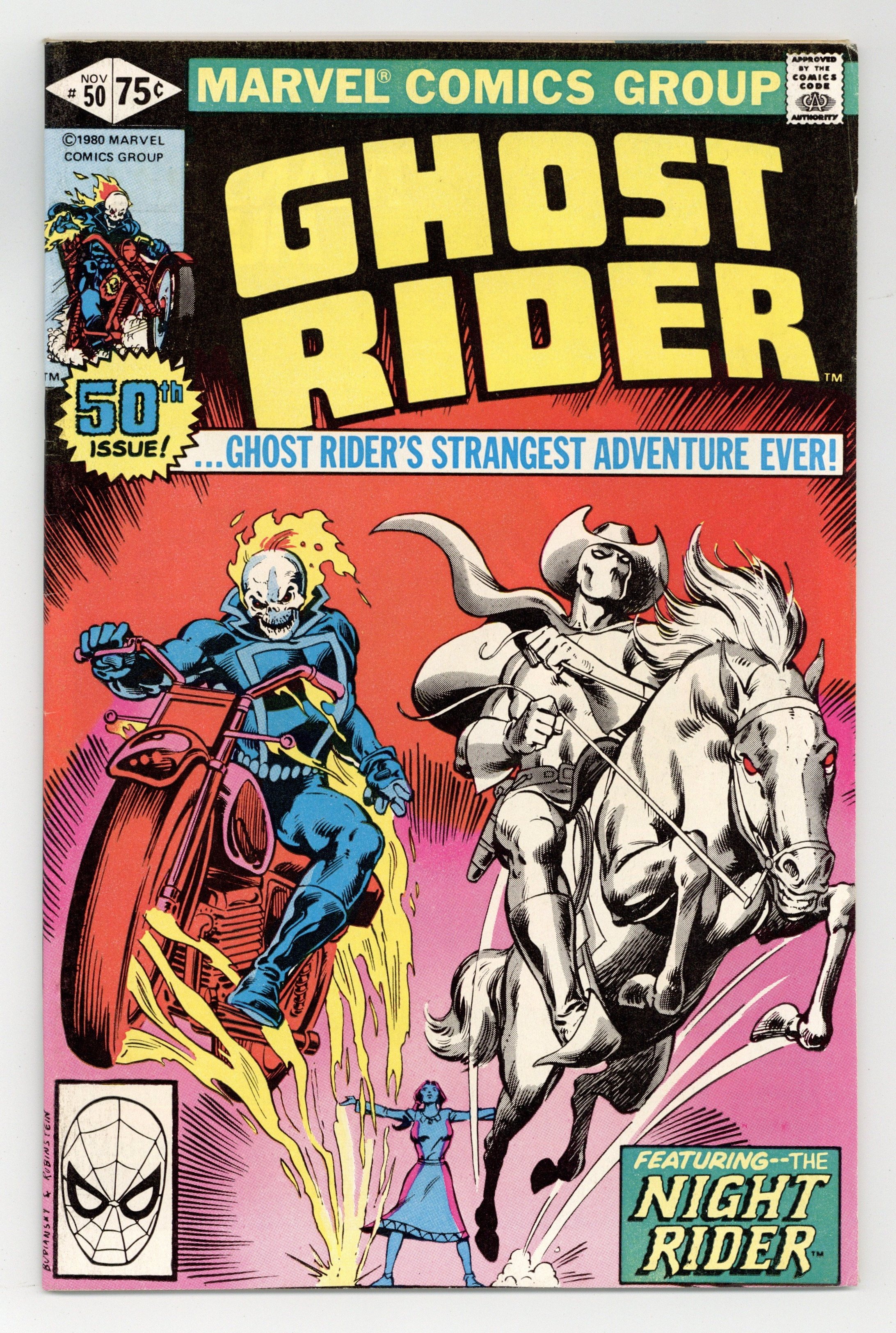Starts Jan 19 Direct Edition. Giant size 50th issue - "Manitou's Anger...Tarantula's Sting!" Guest-starring the Night Rider. Story by Michael Fleisher. Art by Don Perlin. Cover by Bob Budianski and Joe Rubenstein. Get ready for the most macabre team-up yet as the modern day Ghost Rider meets the Night Rider from the Ghost Rider of the Old West. 48 pages, FC. NOTE: Mr. Fantastic stars in Hostess ad "The Power of Gold!" Cover price $0.75.