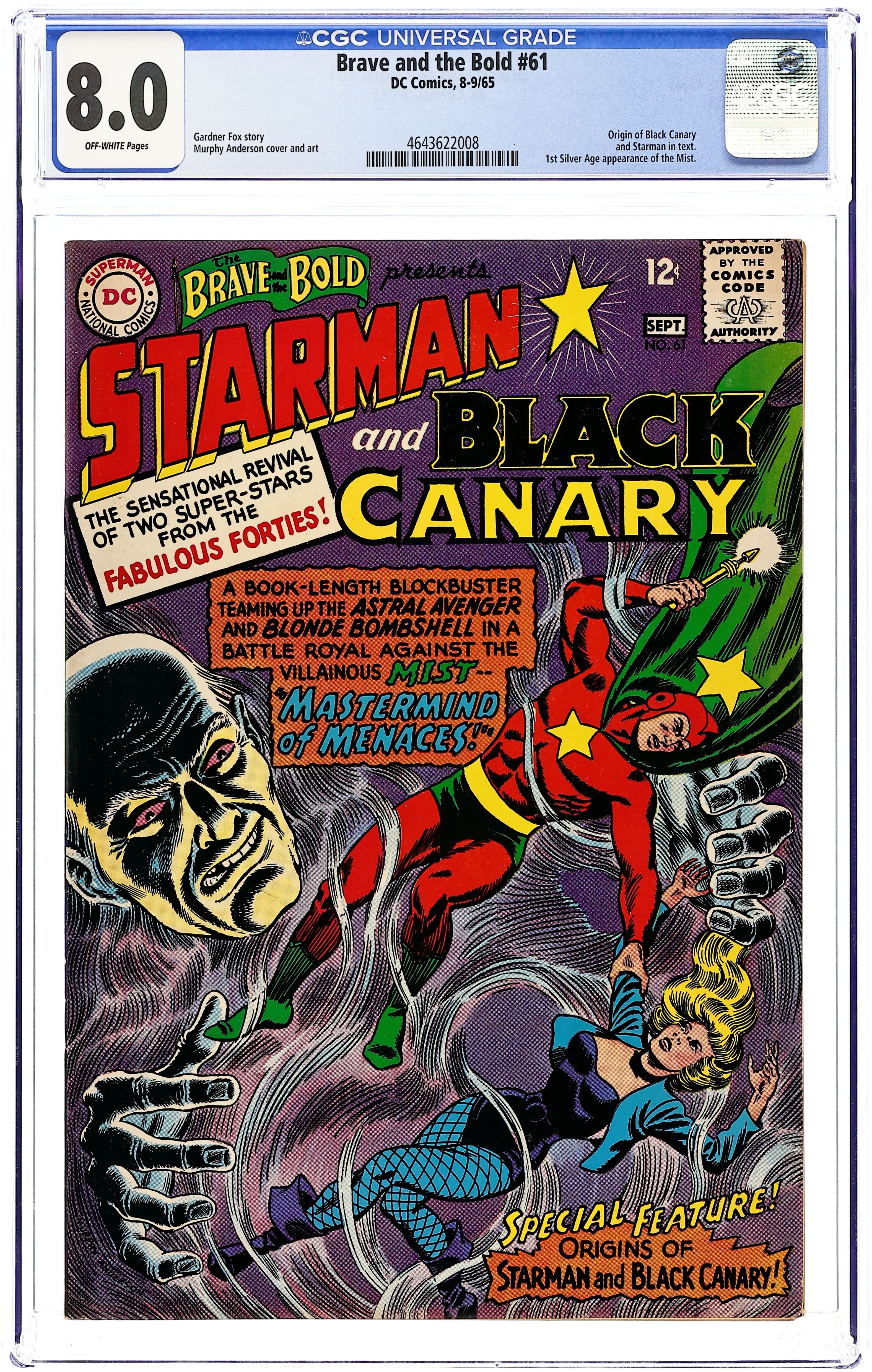 Starts Feb 9 Cover by Murphy Anderson. "Mastermind of Menaces," script by Gardner Fox, art by Murphy Anderson; The villainous Mist returns to his life of crime by using flowers from Dinah Drake's floral shop to hypnotically induce wealthy people into parting with large sums of money, and when Starman gets involved in the case, the Mist figures out a way to nullify his famed Gravity Rod. The Origin of Starman article by Julius Schwartz, art by Jack Burnley. The Origin of Black Canary article by Julius Schwartz, art by Carmine Infantino. 36 Pages, Full Color. Cover price $0.12.