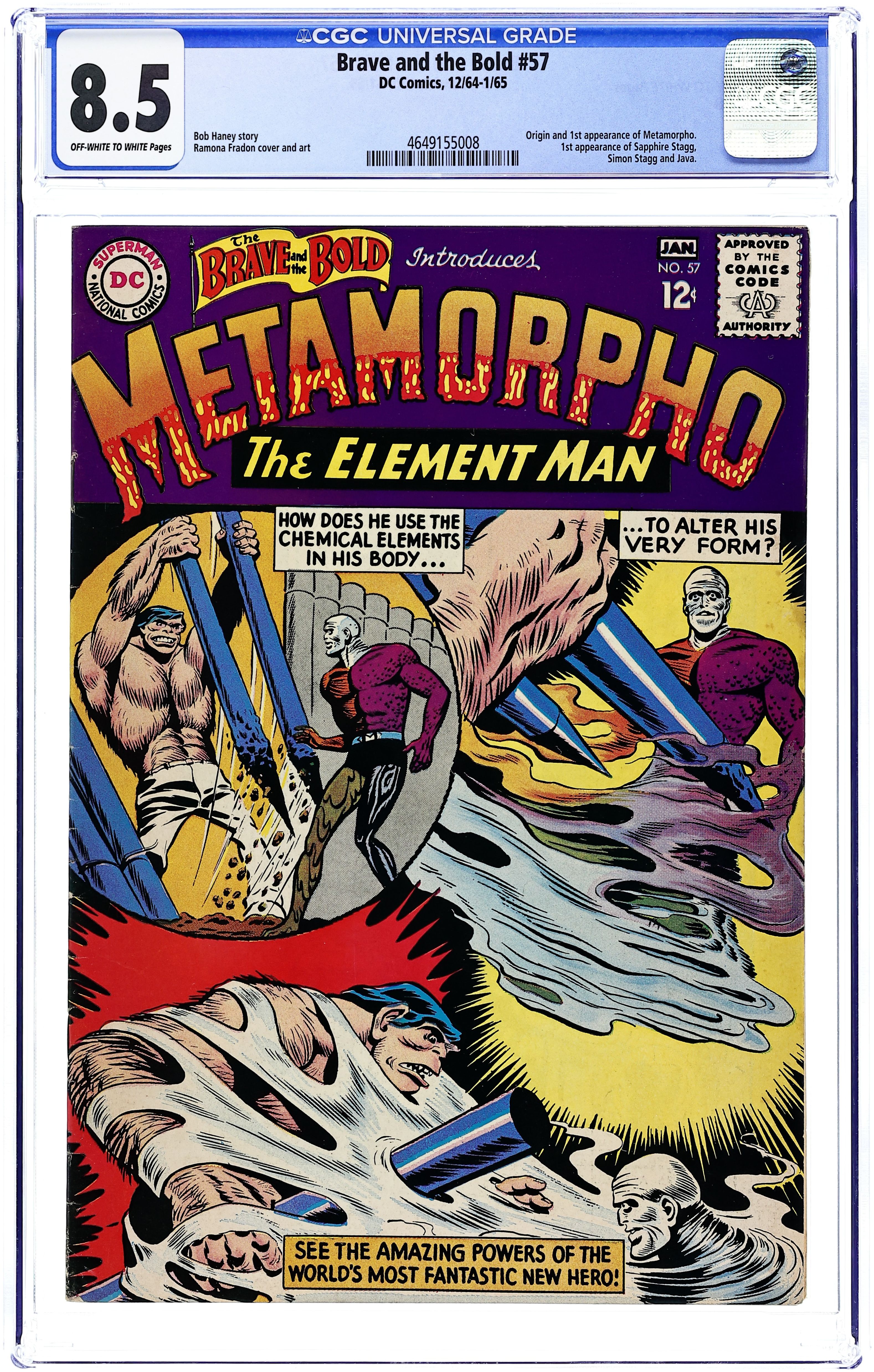 Starts Jan 3 Cover pencils by Ramona Fradon, inks by Charles Paris. 1st appearance of Metamorpho in "The Origin of Metamorpho," script by Bob Haney, pencils by Ramona Fradon, inks by Charles Paris; Rex Mason agrees to do one last trip for Simon Stagg which will net him enough money to marry Sapphire; Simon send Java with Rex with orders to strand him in Egypt; Java accidentally traps Rex in a pyramid where Rex is given strange powers over the chemical elements. 36 Pages, Full Color. Cover price $0.12.