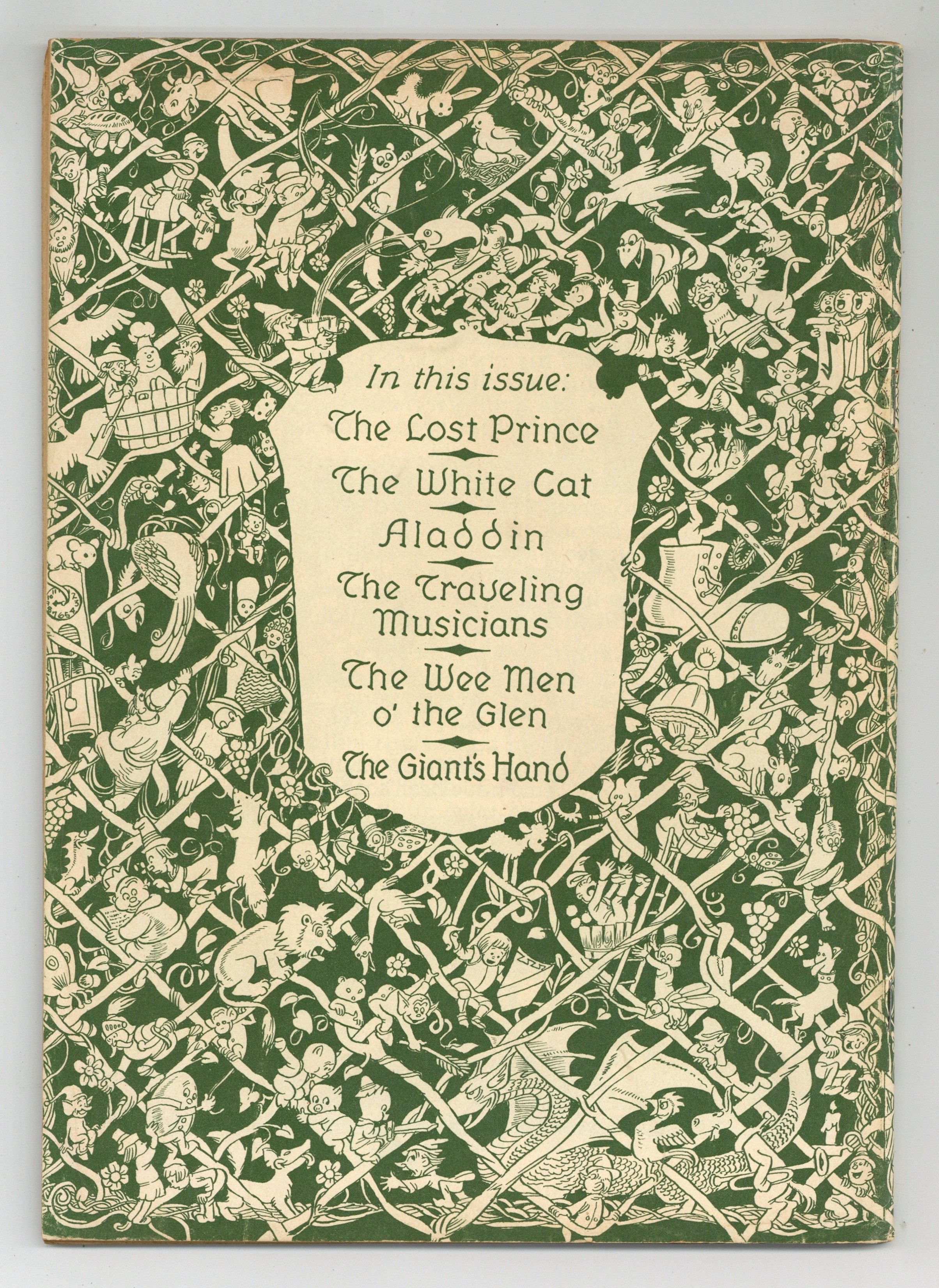 Starts Jan 19 Cover by Walt Kelly. Stories and art by Walt Kelly, Arthur Jameson and L. Bing. Dell puts fairy tales and fables into the hands of former Disney animator Walt Kelly, creator of beloved comic strip Pogo. Kelly adapts two classic fables: A knight searches for a kidnapped prince. And The Travelling Musicians of Bremen, by the Brothers Grimm. A beggar boy gets a chance to live like a prince after he finds a lamp with a genie in it. The Lost Prince; The White Cat; Aladdin and his Wonderful Lamp; Grimms the Travelling Musicians; The Wee Men Othe Glen; The Giants Hand. 64 Pages, Full Color. Cover price $0.10.