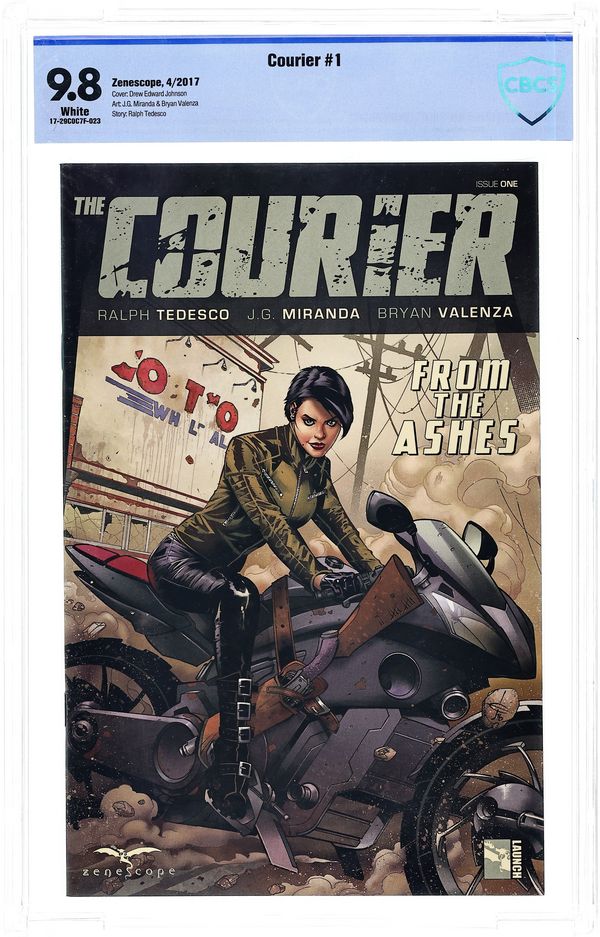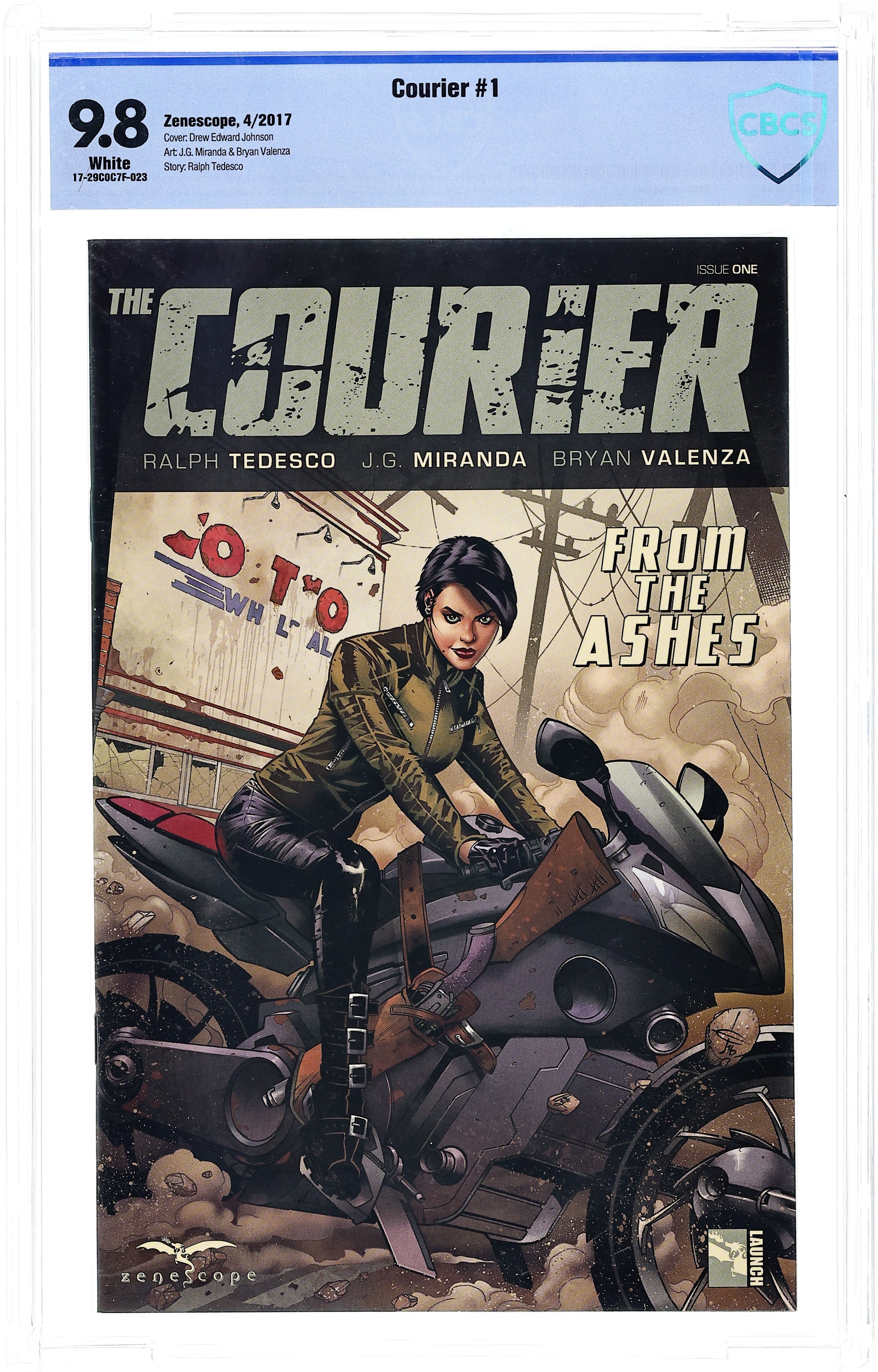 Written by Ralph Tedesco. Art by J.G. Miranda and Bryan Valenza. Cover by Drew Edward Johnson. In 2033 less than 1% of the population survived a devastating pandemic virus. Half of those who lived were immune while half of the survivors mutated into something disturbingly subhuman. Now decades later, the world has rebuilt in many ways but has become something else entirely. Strongholds of human survivors have been set up independently of one another across parts of what is formerly the United States. The rich live in highly guarded Utopias where technology and even an economy has been restored. However, the vast 'wasteland' between strongholds is a very dangerous and unforgiving place where the poor are forced to live in areas where gangs, pirates and the mutated roam free. Couriers are key to the survival of the Strongholds and are paid handsomely to deliver valuables between them. Eve Harper is one of the best couriers there is, but when she takes a job to find a missing shipment for an extremely dangerous drug dealer named Gillings, Eve is forced to use every trick she's ever learned in order to survive the riskiest job of her life. 28 pages, full color. Rated M Cover price $3.99.