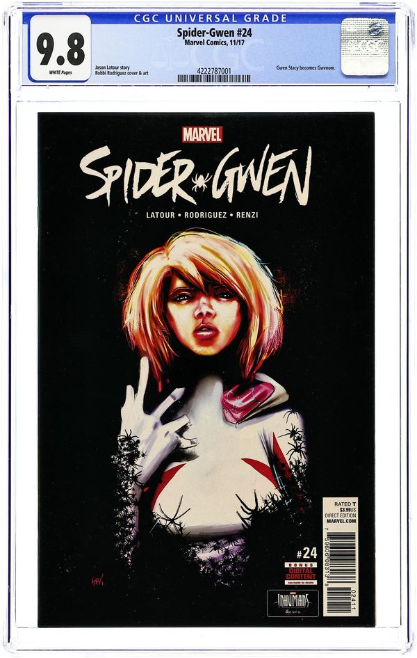 Written by Jason Latour. Art and Cover by Robbi Rodriguez. The aftermath of the PREDATORS storyline leaves Gwen in a VERY different place. Matt Murdock's plans all come home to roost, and when you plan like our good friend Murderdock does, you know that ain't pretty. WHAT IS THE NEXT EVOLUTIONARY STEP FOR SPIDER-GWEN?! 28 pages, full color. Rated T Cover price $3.99.