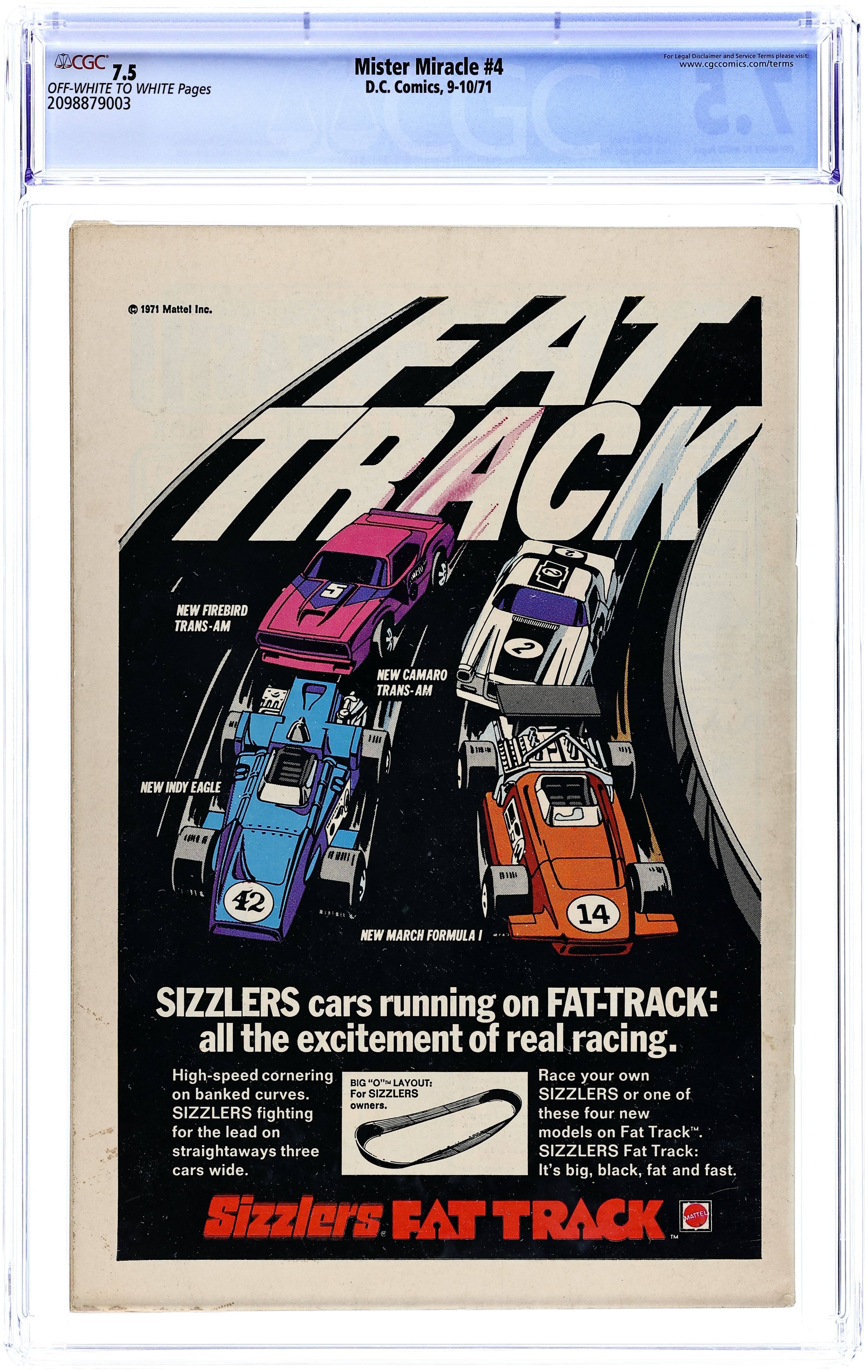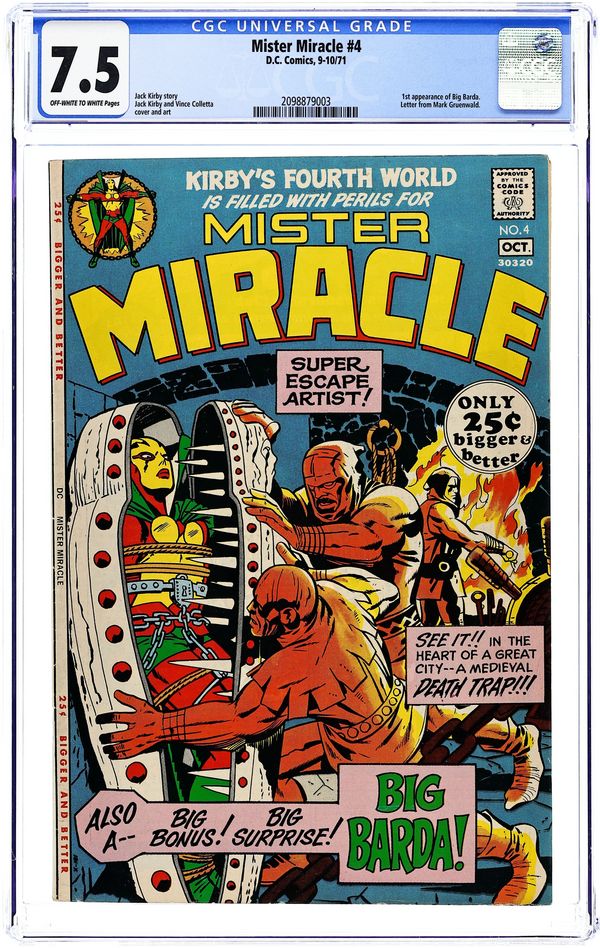 "The Closing Jaws of Death." Yet another action packed, whiz bang adventure, this issue finds Mister Miracle trying to escape from a trap by Dr. Bedlam. Features the first appearance of Big Barda. Back-up Boy Commandos reprints begin in this issue. Script, pencils, and cover by Jack Kirby. Inks by Vince Colletta. Cover price $0.25.