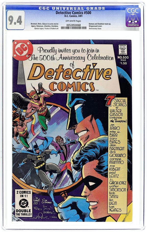 Direct Edition. This special 68-page square-bound giant edition commemorates Batman's 500th appearance in Detective Comics. The lead story for this issue, "All My Enemies Against Me!" kicks off with an impressive two-page splash featuring a rogue's gallery of Batman's greatest foes--17 of Gotham's worst villains. The Joker isn't depicted only because he arrives late to the council of criminals. It's one wild, book-length saga as Batman, Robin and Batgirl mix it up with the 17, plus the Joker, Catwoman and Killer Crock. This enjoyable story is written by Gerry Conway with impressive art by Don Newton and skilled inking from Alfredo Alcala. 68 pgs. Cover price $1.50.