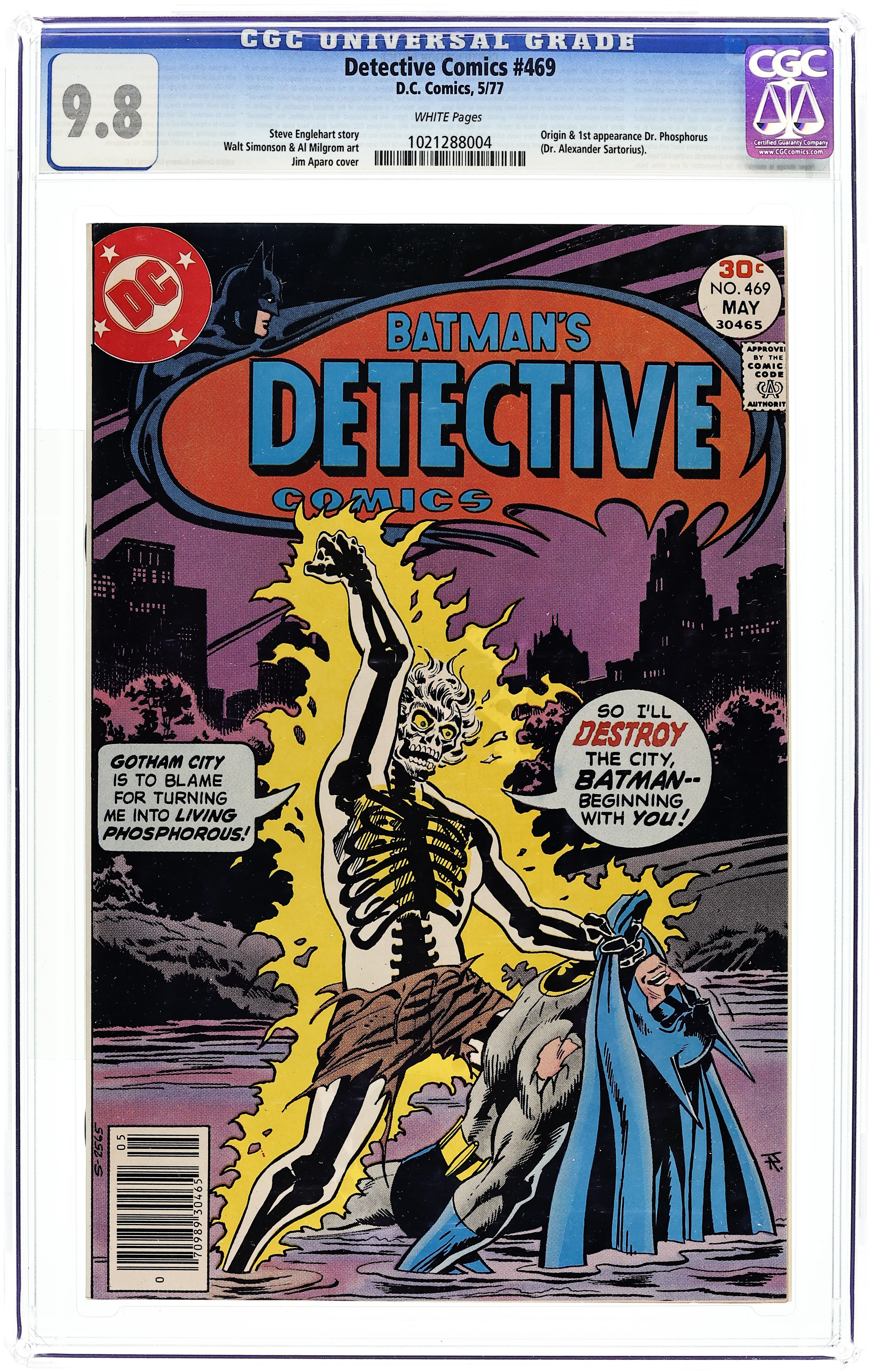 Starts Apr 4 Last 30-cent cover-priced issue. Cover by Jim Aparo. "…By Death's Eerie Light!" script by Steve Englehart, pencils by Walt Simonson, inks by Al Milgrom; When Alfred collapses, Batman discovers many more people are mysteriously becoming sick; The Dark Knight realizes that the Gotham City water supply has been contaminated, so he goes to the Gotham Reservoir and finds the person responsible for the contamination, Dr. Phosphorus. "The Origin of Dr. Phosphorus," script by Steve Englehart, pencils by Walt Simonson, inks by Al Milgrom; Dr. Phosphorus visits an old colleague and explains how he became a monster when the reactor core at a nuclear power plant in which they both invested exploded and that he now plans to take his revenge on all those he blames, particularly City Council Chairman Rupert Thorne. Hostess snack cakes ad with Wonder Woman. 36 pgs., full color. $0.30. Cover price $0.30.