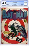 1st appearance of Alfred Pennyworth - Cover by Jerry Robinson. "The Joker Reforms!", script by Don Cameron, pencils by Bob Kane, inks by Jerry Robinson and George Roussos; After robbing a jewelry store, the Joker crash-lands his escape plane and loses his memory; He stumbles into a town where he becomes a hero... but not to the other members of his gang, who seek the jewels, and come looking for him, as do the Caped Crusaders. One-page Shorty story by Henry Boltinoff. "The Grade A Crimes!", script by Ruth "Bunny" Lyons Kaufman (as Bunny Lyons), pencils by Jack Burnley, inks by Jack Burnley and Ray Burnley (backgrounds); After a series of early-bird robberies, Batman notes the appearances of a milkman and his horse-drawn wagon at the scene of every crime, and makes the connection that it is involved in the heists. "The Adventure of the Branded Tree!", script by Don Cameron, pencils by Jack Burnley, inks by Jack Burnley and Ray Burnley (backgrounds); Batman and Robin track down the secret of a dagger-branded tree that led to the murder of two lumberjacks. "Motive" text story by Eric Carter. One-page Clancy the Cop story by Henry Boltinoff. "Here Comes Alfred!", script by Don Cameron, pencils by Bob Kane, inks by Jerry Robinson and George Roussos (backgrounds); Things get very complicated when an English butler, named Alfred, suddenly shows up on the doorstep of Wayne Manor and announces that he is there is attend to their needs in order to fulfill a promise that he made to the original butler for the Wayne family. 68 Pages, Full Color. Cover price $0.10.