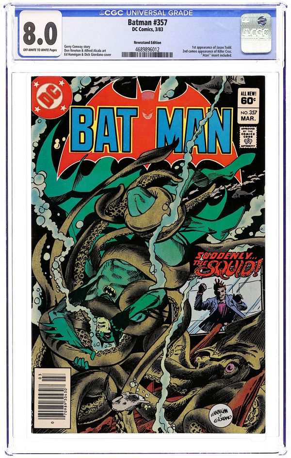 Starts Apr 4 1st printing. Direct Edition. 1st appearance of Jason Todd and Killer Croc (cameo). Cover pencils by Ed Hannigan, inks by Dick Giordano. "Squid" starring Batman, Dick Grayson, Commissioner Gordon, Hamilton Hill, Joey Taylor, Waldo Flynn, Olivia Ortega, and the Squid (first appearance), script by Gerry Conway, pencils by Don Newton, inks by Alfredo Alcala; The Squid comes to Gotham City to launch a takeover of its underworld, and to trap the Batman; A mobster offering crooked protection threatens a circus owner; Refusing to give in, the owner unwittingly puts a target on the heads of his star performers, a husband and wife trapeze act; Days later, a young boy discoveres that his parents had been brutally murdered. Taken in by the sympathetic millionaire Bruce Wayne (Batman) the boy trains and becomes his new mentor's sidekick as Robin, the boy wonder; Not Dick Grayson, though--This time it was the copycat story of Jason Todd, the second person to become Robin. Story continues in the pages of Detective Comics (1937 1st Series) #524. Letter to the editor from comics editor/writer Kevin Dooley. 40 Pages, Full Color. Cover price $0.60.