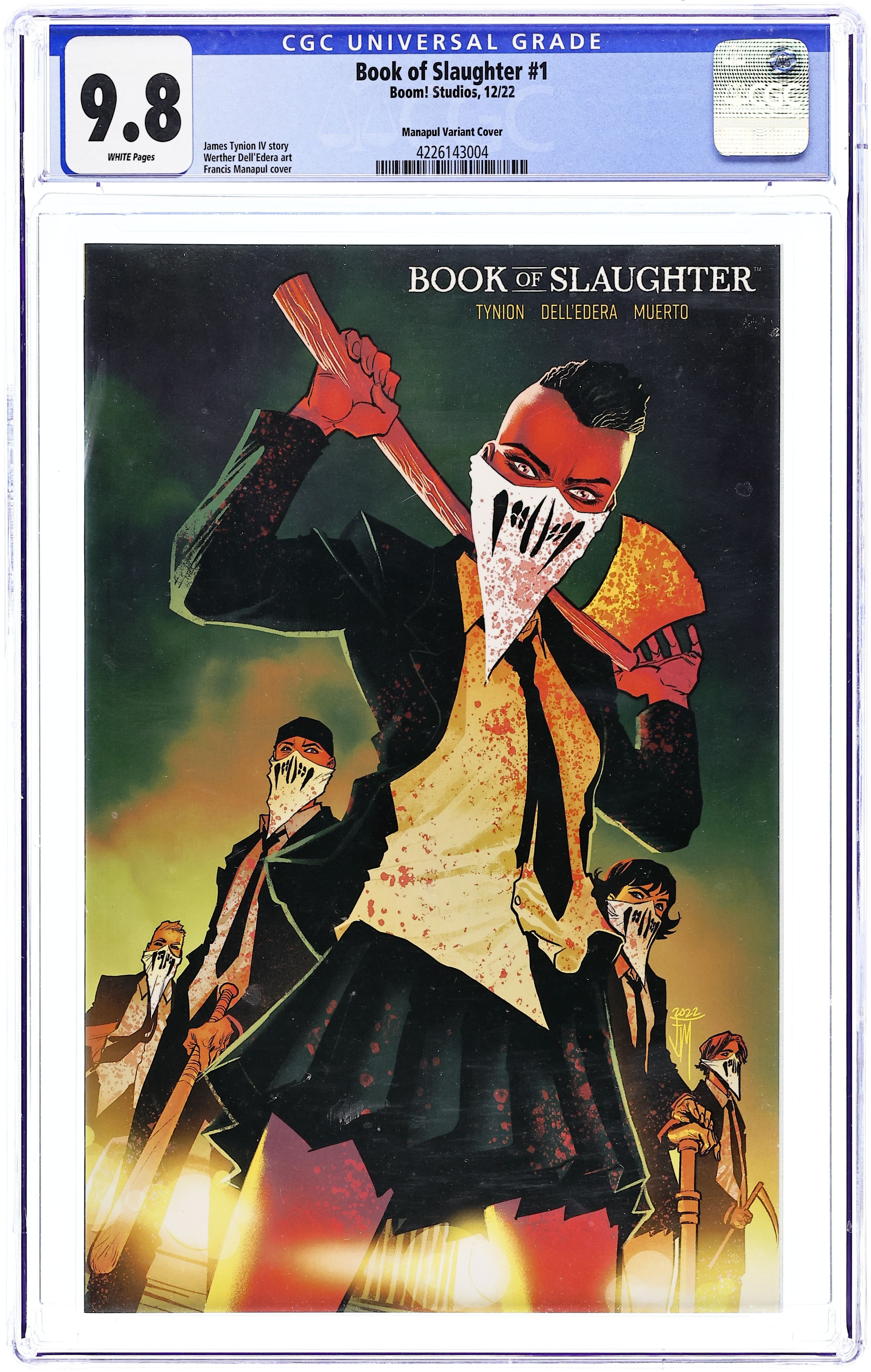 Written by James TynionIV. Art by Werther Dell'Edera. Cover by Francis Manapul. The future of the Slaughterverse is laid bare by Something is Killing the Children and House of Slaughter creators James Tynion IV and Werther Dell'Edera in the very first SIKTC one-shot special! From the sidelines to the spotlight, Book of Slaughter follows the white mask Maxine Slaughter… but will her loyalties remain where they are, or will she show her true colors? In addition to being a precursor to the upcoming chapters of both series, this special issue features a sizable guidebook that delves into the deep lore of the Order of St. George! 64 pages, full color. Rated Teen Cover price $9.99.