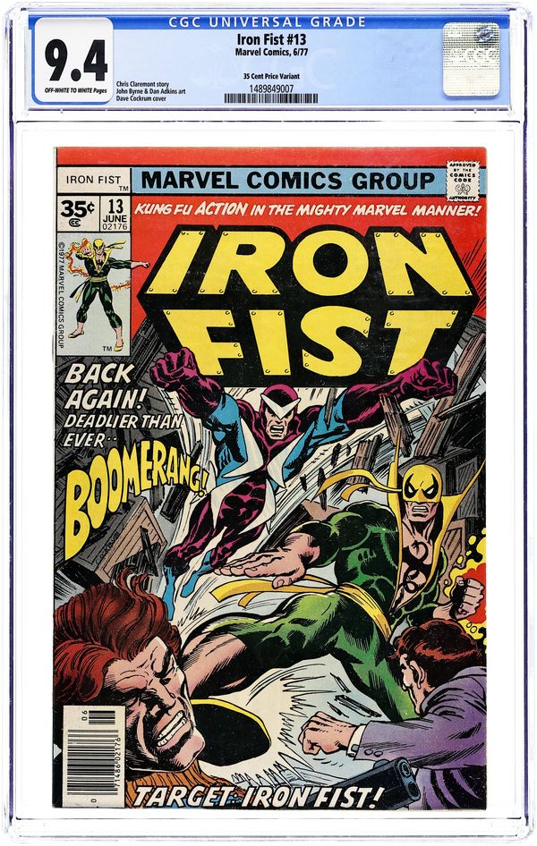 35 Cent Price Variant, limited distribution. "Target: Iron Fist!" Guest-starring Misty Knight. Story by Chris Claremont. Art by John Byrne and Dan Adkins. The assassin known as Boomerang is back and he is deadlier than ever. And this time he is here for Iron Fist. Cover price $0.35.