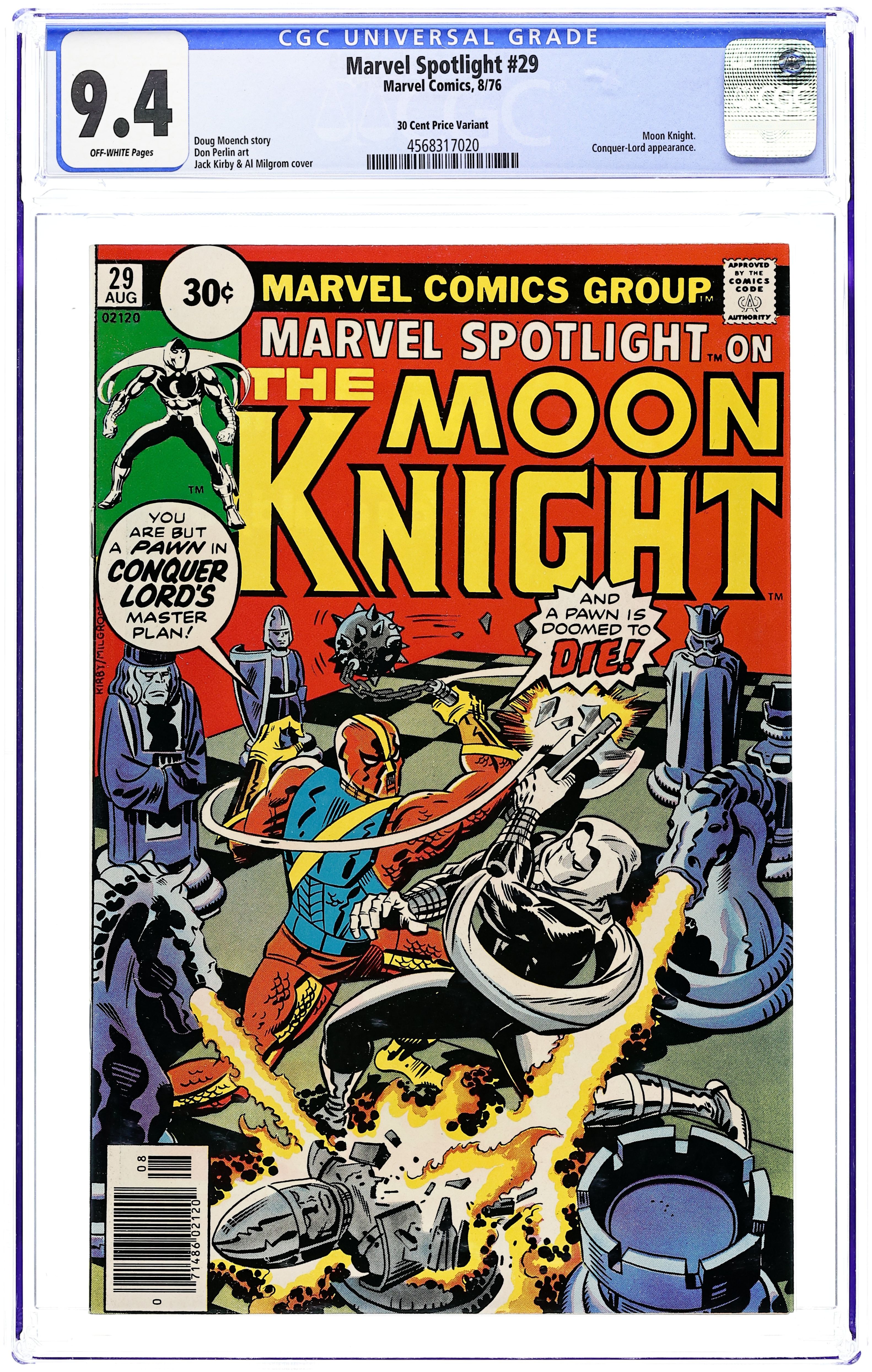 30 cent cover price variant with circle price style. Cover pencils by Jack Kirby, inks by Al Milgrom. The Deadly Gambit of Conquer-Lord!, script by Doug Moench, art by Don Perlin; Moon Knight battles Conquer-Lord. Cover price $0.30.