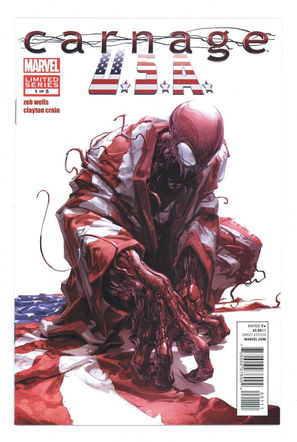 Cover by Clayton Crain WELCOME TO CARNAGE U.S.A. - THE ULTIMATE RED STATE! Carnage's maniacal reign of terror continues, courtesy of the critically acclaimed creative team of Zeb Wells and Clayton Crain! Spider-Man and the Avengers must go on a brutal hunt to capture Cletus Kasaday before a small town in the American heartland falls under his mass-murdering spell! Buckle in and prepare for a violence packed adventure! Carnage U.S.A. wants YOU! Cover price $3.99.