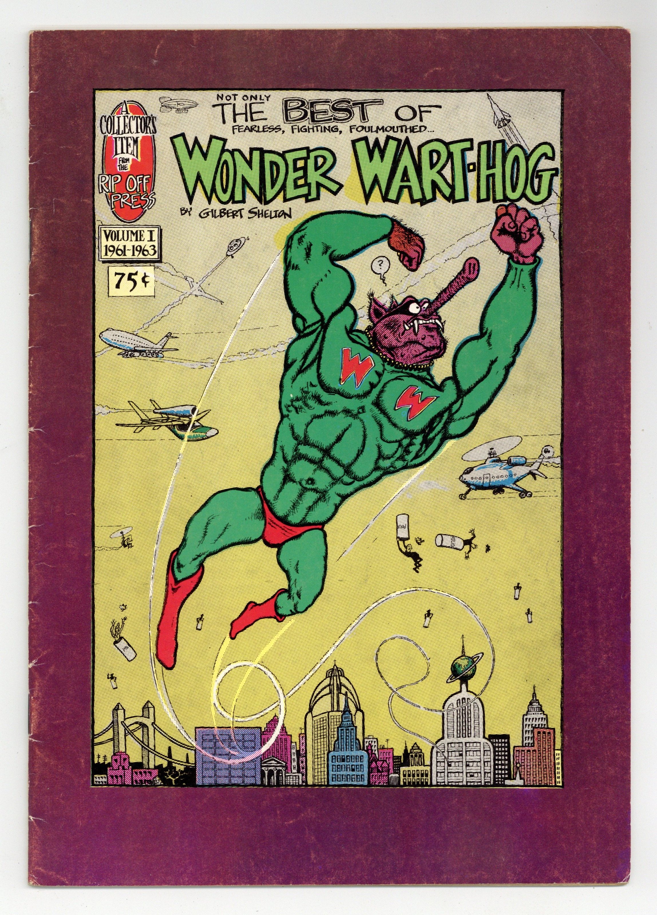 Tags: UndergroundPublished 1973 by Rip Off Press.$11.002nd Printing. Has a 75 cent cover price and purple border around the cover. Reprints the following stories from 1962-63 by Gilbert Shelton, "Wonder Wart-Hog Meets the Merciless Masked Meanie", "Wonder Wart-Hog meets Super-Patriot", "Wonder Wart-Hog Meets the Mob" (written by Bill Killeen), and "Wonder Wart-Hog Meets SuperCop"; 32 pages; b&w; 6 7/8-in. x 9 7/8-in. Cover price $0.75.