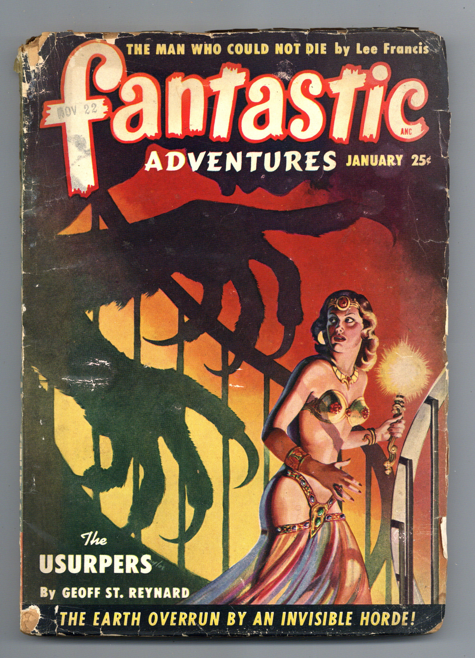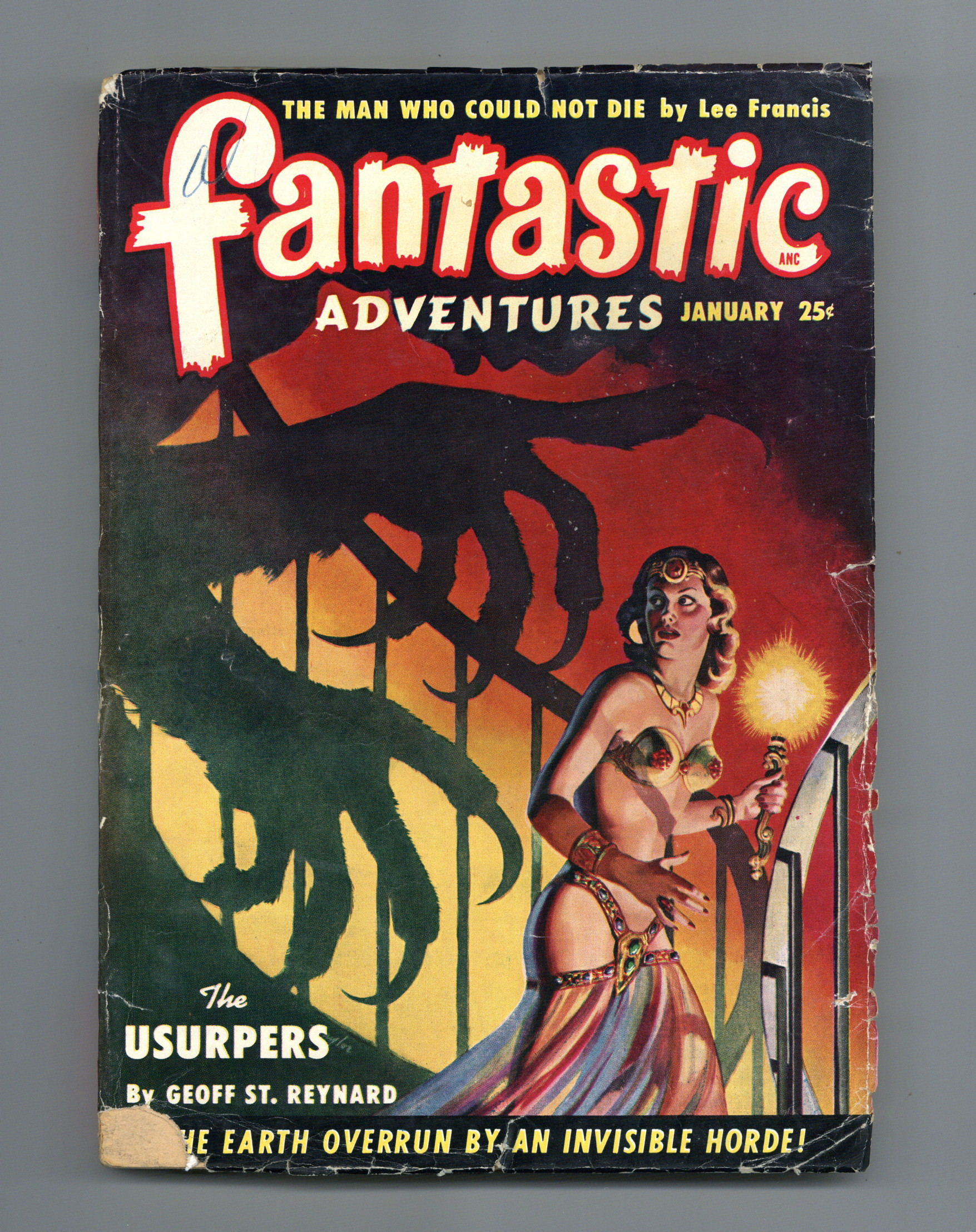 Volume 12, Issue 1 - January, 1950. Cover by Ramon Naylor. Stories include "The Usurpers" by Geoff St. Reynard, "The Man Who Could Not Die" by Lee Francis, "Jirandel" by Warren Kastel, "Sanctuary" by Charles Recour, "The Exteroceptor Deceptor" by Craig Browning, "The Golden Mask of Agarti" by John & Dorothy deCourcy, "Revolt in Pacifico" by Anthony B. Ott, and "The Crumbling World" by Berkeley Livingston. Illustrations by Leo Ramon Summers, Bill Terry, and Murphy Anderson. 7-in. x 9.75-in.; black and white; 162 newsprint pages. Cover price $0.25.