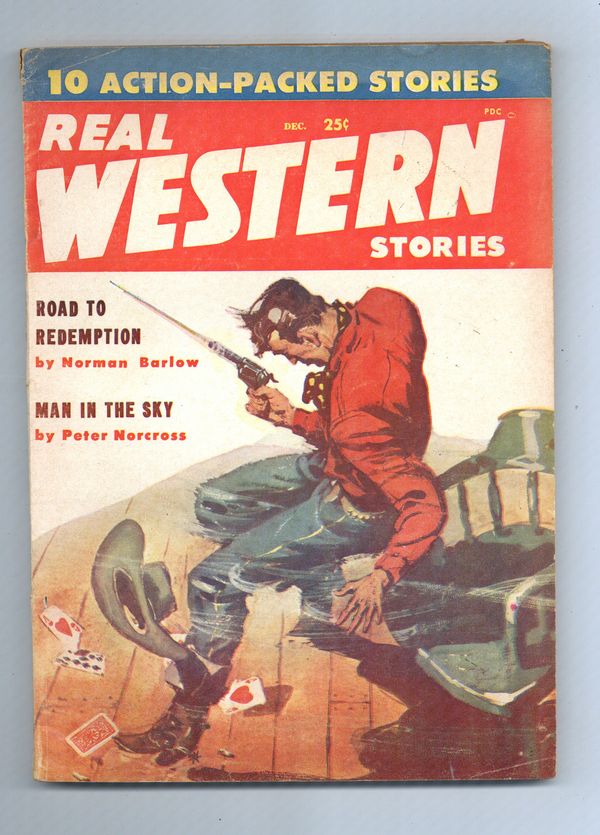 Dec 1958. Western Stories: Norman Barlow "Road to Redemption", Peter Norcross "Man in the Sky", C. H. Cogswell, Brett Austin, James Hines, Harlan Clay, Ell Emm Moore, Elton Webster, Lew Smith, and Art Cleveland. 6 5/8" x 9 1/4"; black and white; 98 newsprint pages. Cover price $0.25.