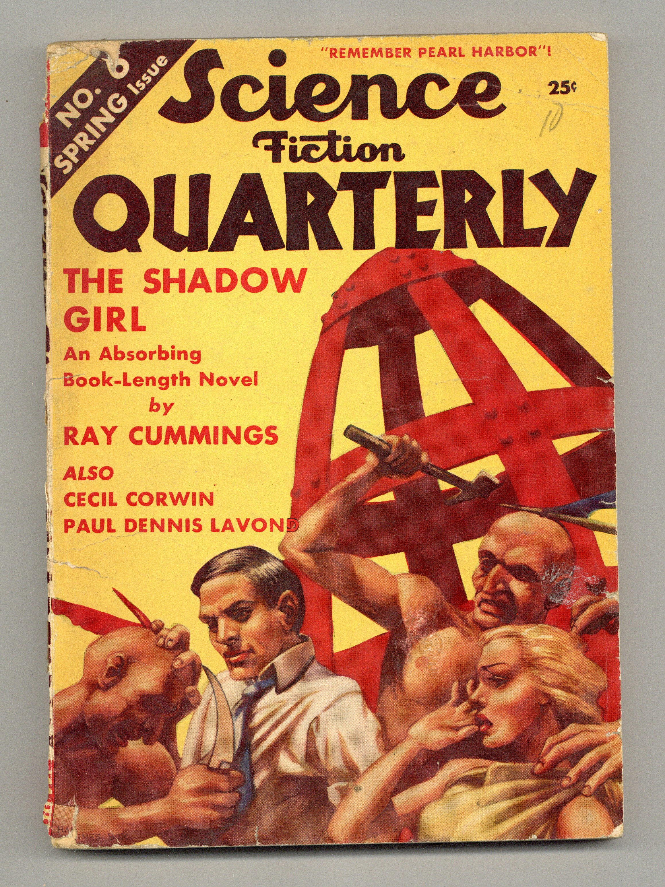 Spring 1942. Cover by Hannes Bok. Science Fiction by Ray Cummings "The Shadow Girl", Frederick Pohl & C. M. Kornbluth & Robert A. Lowndes (as "Paul Dennis Lavond"), Donald A. Wollheim (as "Millard Verne Gordon"), George R. Hahn, C. M. Kornbluth (as "Cecil Corwin"), and James Hollis Mason. Illustrations by Smolenski, Chester Cohen & Damon Knight (as "Conanight"), John R. Forte, Jr., and Hannes Bok. 6 3/4" x 9 1/2"; black and white; 144 newsprint pages. Cover price $0.25.