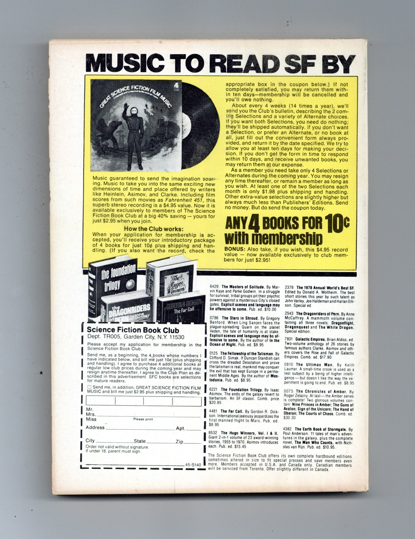 February 1979. Cover by Dean Ellis. Stories: "Titan"(Part 2) by John Varley, "Triad" by Sam Nicholson, "Songs of a Sentient Flute" by Frank Herbert, "Last Hunt" by Eric Vinicoff and Marcia Martin, "Letter to Ed" by Edmundo Hamiltowne, and "The Odds Man" by Gary Alan Ruse. Science Fact article: "Today's Computers, Intelligent Machines and our Future" by Hans Moravec. State of the Art article: "A Computer that Writes Science Fiction" by Paul J. Nahin. Softcover, 5.25-in. x 7.5-in.; 178 newsprint pages, B&W. Cover price $1.25.