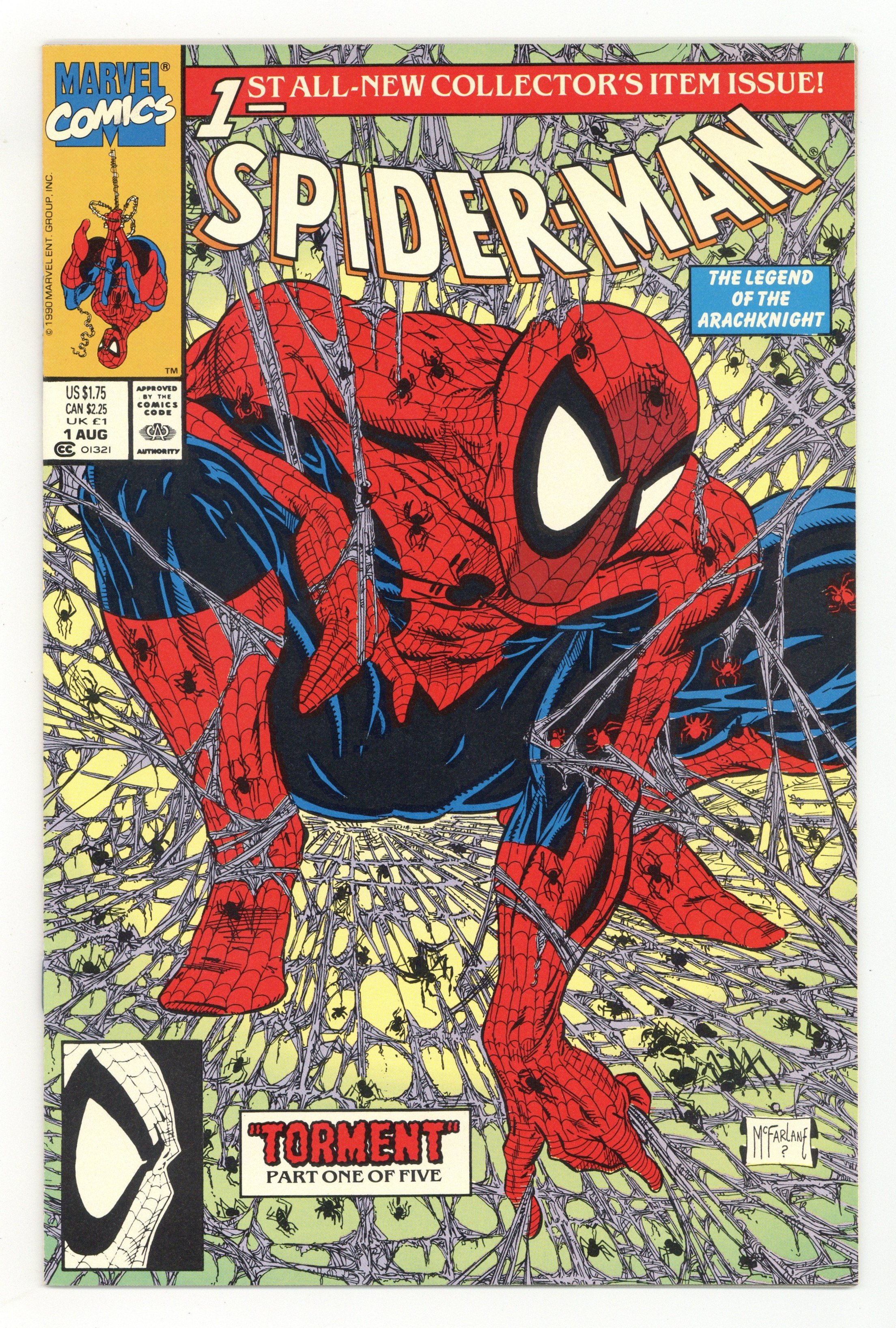 Unbagged Direct Edition - Torment Part 1 of 5. "Torment" Script and art by Todd McFarlane. Cover by Todd McFarlane. Fresh off his legendary run on the Amazing Spider-Man series, superstar artist Todd McFarlane takes the reins of his own Spider-title! Right off the bat the breathtaking action begins as mysterious and ominous drums awaken the Lethal Lizard! And send the reptilian creature on a path of death and destruction thru New York City! Spider-Man's nightmare is just starting! Appearance by Mary Jane Watson. (Notes: Spider-Man #1 was one of the first Marvel issues to feature numerous variant covers. The Spider-Man (1990) series became the fourth monthly title for the web-slinger. This issue was published the same month as Amazing Spider-Man 337. The letters page features an essay by Todd McFarlane. The webbing on the cover may be gray or purple.) 32 pages. Cover price $1.75.