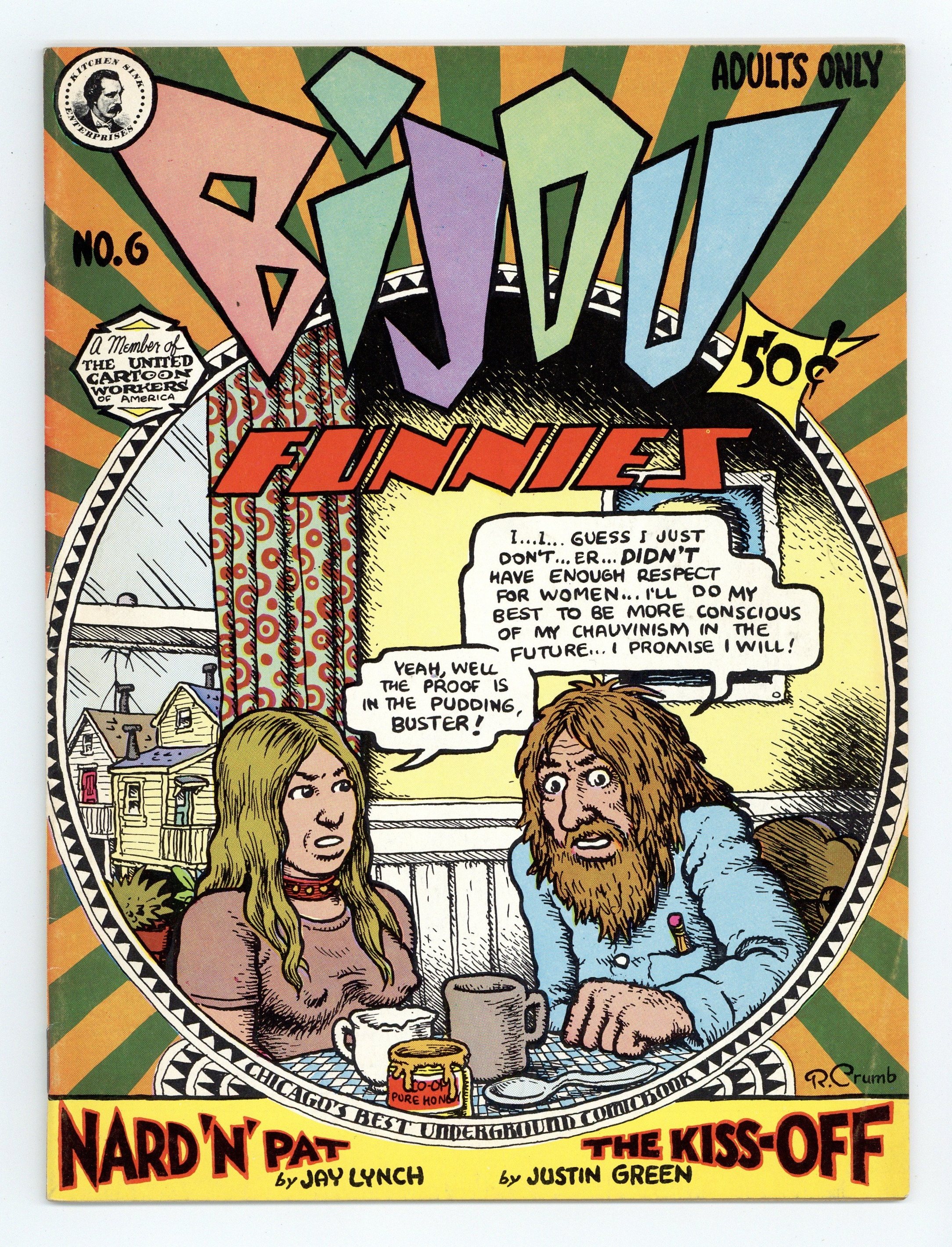 1st printing. The influential underground comic edited by Jay Lynch. Cover by Robert Crumb. Stories and art by Robert Crumb, Jay Lynch, Justin Green, and Skip Williamson. All later printings of issue #6 are noted underneath the indicia on the inside front cover. 6 1/2-in. x 9-in., 36 pages, B&W. MATURE READERS. NOTE: 1st printings have no printing information. Cover price $0.50.