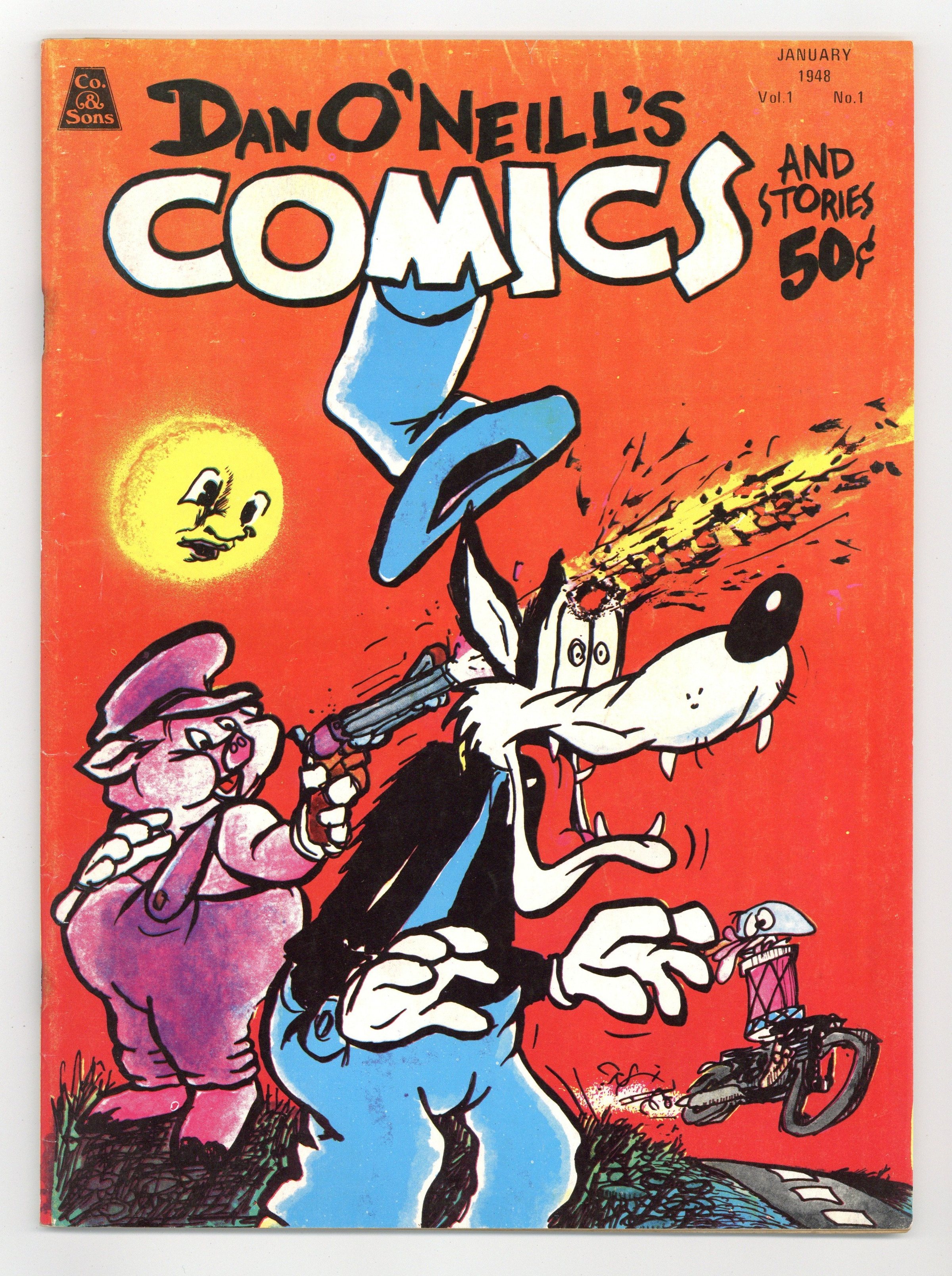 Published 1971 by Comics and Comix Co..$22.00Volume 1, Issue 1 "January 1948" Story, Art and Cover by Dan O'Neill. Dan O'Neill's scathing satire of political and religious themes using parodied versions of Disney characters and his most famous creations Hugh and Fred earned the ire and outrage of the public and editors alike with his syndicated news paper strip "Odd Bodkins", and eventually led to the loss of his syndication, and job! See what happens when he really lets loose in "Dan O'Neill's Comics"! 7-in. x 10-in., B&W. NOTE: Dates on the cover are used to aid in a parody manner. These issues were published in 1971. The B Version DOES have red ink on interior front cover.