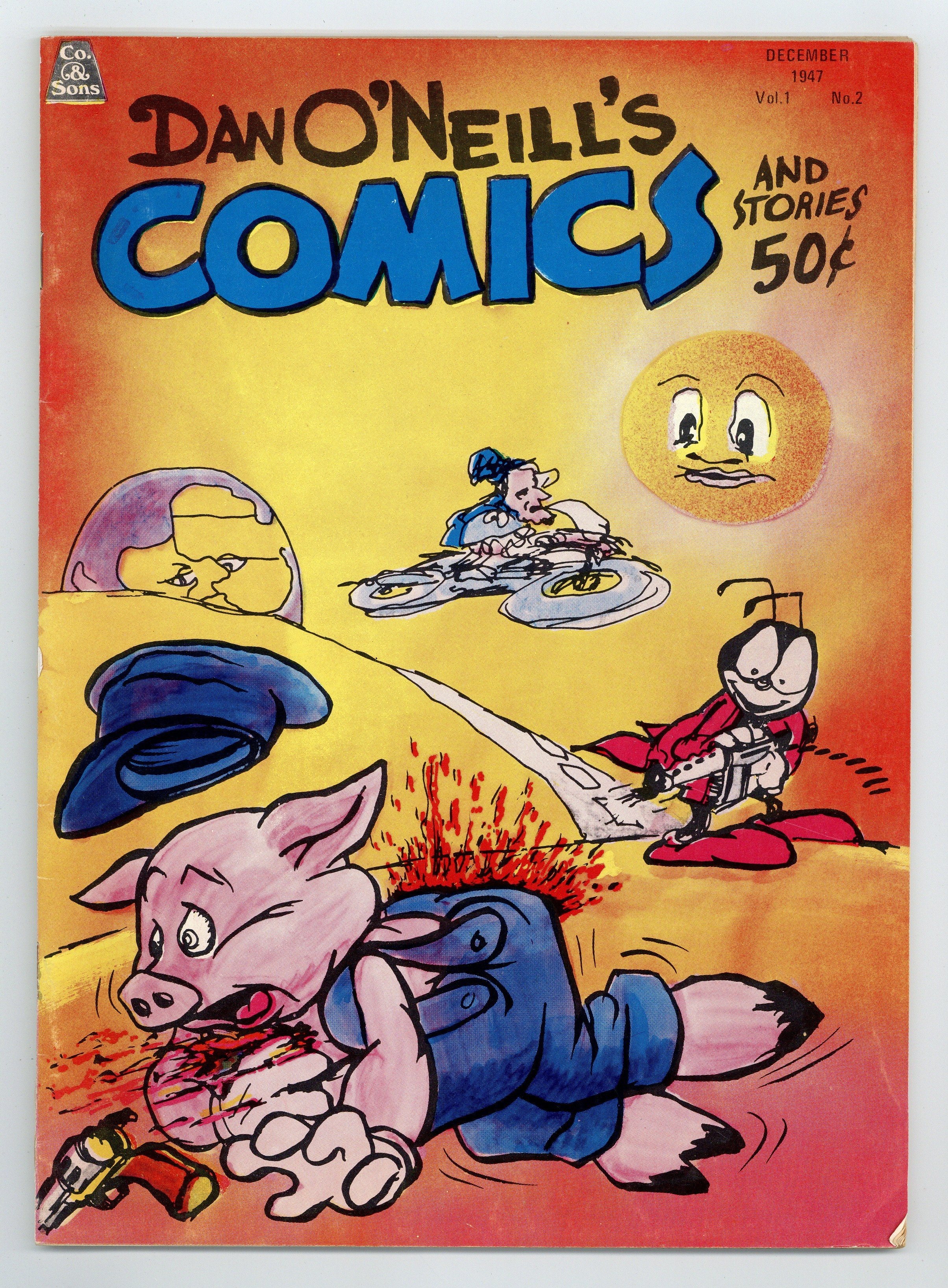 Published 1971 by Comics and Comix Co..$14.50Volume 1, Issue 2 "December, 1947" Story, Art and Cover by Dan O'Neill. Dan O'Neill's scathing satire of political and religious themes using parodied versions of Disney characters and his most famous creations Hugh and Fred earned the ire and outrage of the public and editors alike with his syndicated news paper strip "Odd Bodkins", and eventually led to the loss of his syndication, and job! See what happens when he really lets loose in "Dan O'Neill's Comics"! 7-in. x 10-in., B&W. NOTE: Dates on the cover are used to aid in a parody manner. These issues were published in 1971. Cover price $0.50.