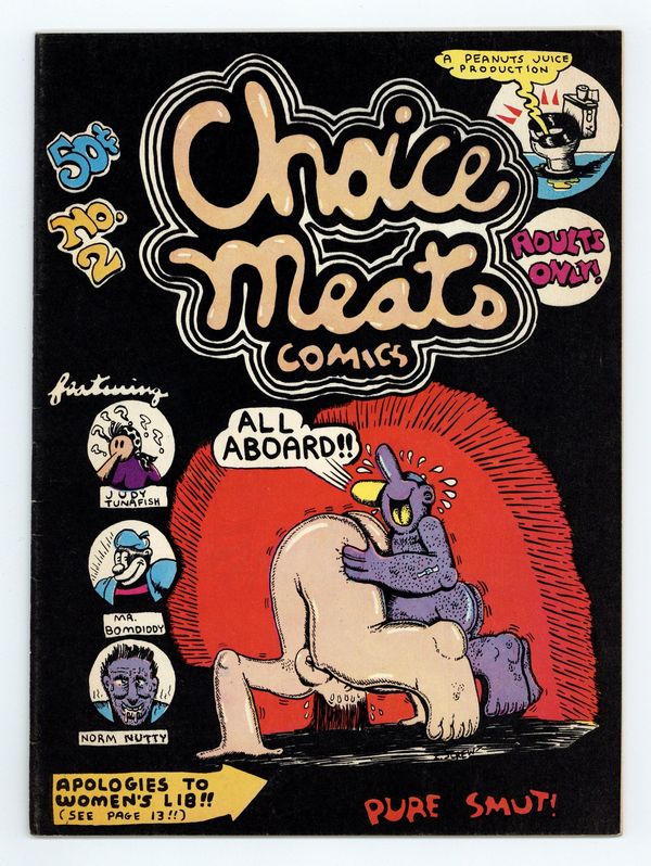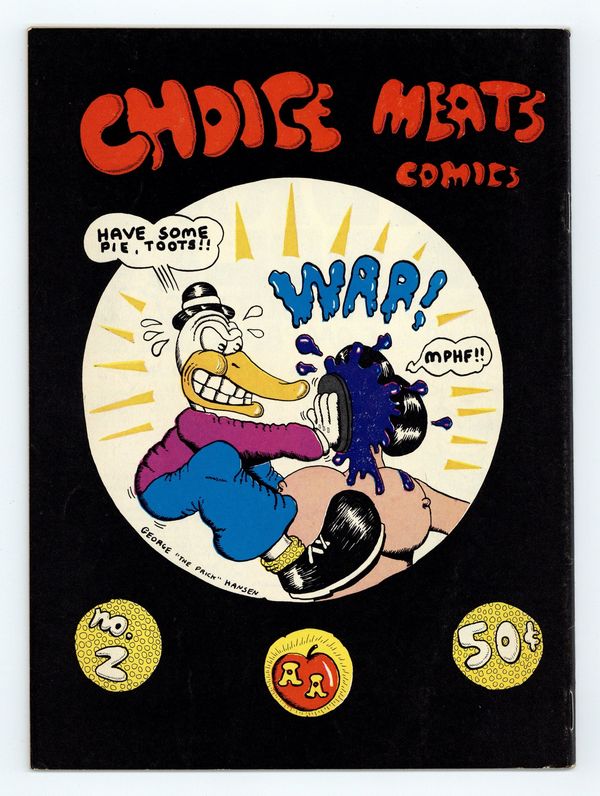 Choice Meats Comics (1971 Peanut Juice Productions/Adam's Apple Distributing) #2, 1st Printing GD 2.0Tags: UndergroundPublished 1971 by Peanut Juice Productions.$20.00- 2" spine split from the bottom.