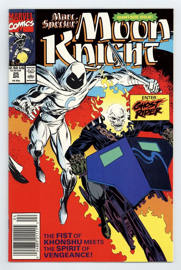 Ghosts of the Past - Written by Howard Mackie. Art by Mark Bagley & Tom Palmer. Ghost Rider guest-stars in a double-sized milestone issue! Flame head helps Moon Knight when the Knights of the Moon challenge Marc Spector's right to serve as a warrior of Khonshu! And if that isn't enough, Plasma attacks, too! 48 pages, full color. Cover price $2.50.