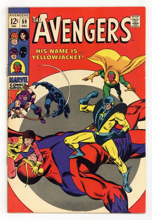 First appearance of Yellowjacket (aka Henry Pym) in "The Name is Yellowjacket!" Part 1 of 2. Script by Roy Thomas. Pencils by John Buscema. Inks by George Klein. Cover by John Buscema and George Klein. A new crime-fighter bursts onto the scene in New York City! And the Daily Bugle loves him already! The brash Yellowjacket barges into Avengers Mansion and boasts about killing Goliath! Shocked by the news; Hawkeye, T'Challa, and the Vision charge forward! But the mysterious Yellowjacket fights them off and absconds with the Wasp! Fearing that Jan is in serious danger, the Avengers pursue Yellowjacket across town! But when Earth's Mightiest Heroes locate their new foe, the Wasp asks them to leave Yellowjacket alone! Wow, why would Jan do that? Because she wants to marry him that's why! Wedding bells ring next issue! Cameo appearances by J. Jonah Jameson, Spider-Man, Jarvis, Nick Fury, Dum Dum Dugan, and the Black Widow. Avengers Lineup: Black Panther, Hawkeye, Wasp, Yellowjacket, and the Vision. (Notes: The letters page includes a letter from Elfquest co-creator Wendy Fletcher (Pini). This two-part story was reprinted in Marvel Super Action 20 & 21.) 36 pages. 12 cent cover price. Cover price $0.12.