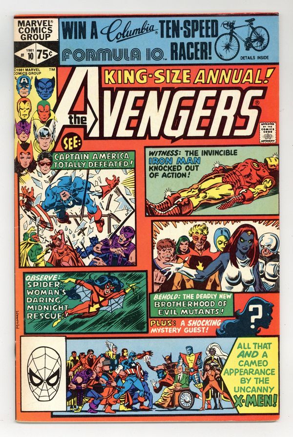 Direct Edition. First appearance of Rogue and Madelyne Pryor in "By My Friends Betrayed!" Spider-Woman, X-Men, Carol Danvers, and New Brotherhood of Mutants guest star. Script by Chris Claremont. Pencils by Michael Golden. Inks by Armando Gil. Cover by Al Milgrom. This action-packed annual has got it all, true believers: the first appearance of Rogue, the spectacular art of Michael Golden, the tragic return of Carol Danvers, and the stupendous struggle between the Brotherhood of Evil Mutants and the mighty Avengers! Following the events of Uncanny X-Men #142, Mystique & her New Brotherhood of Evil Mutants attempt to break four of their members out of Ryker's Island prison! After Rogue and Mystique take down Captain America, Iron Man, and Thor, the rest of the Avengers and Spider-Woman catch up to the villains, and the epic clash erupts! Woven in and around the frantic action at Ryker's Island is the heartbreaking story of Carol Danvers' return to Earth. Her life has fallen apart since leaving for Limbo with Marcus Immortus in Avengers #200, and now, stripped of her powers and memories, Carol begins the long road to recovery. And the first step is an emotional confrontation with her former teammates! Notes: Marvel Super-Heroes #11 (Fall 1992) fills in the details of Carol Danvers' life between Avengers #200 and Avengers Annual #10. The Thing stars in a one-page Hostess ad, "A Lesson to Be Learned!" This issue was reprinted in 1993 in the trade paperback: The Greatest Battles of the Avengers. 52 pages, full color. Cover price $0.75.