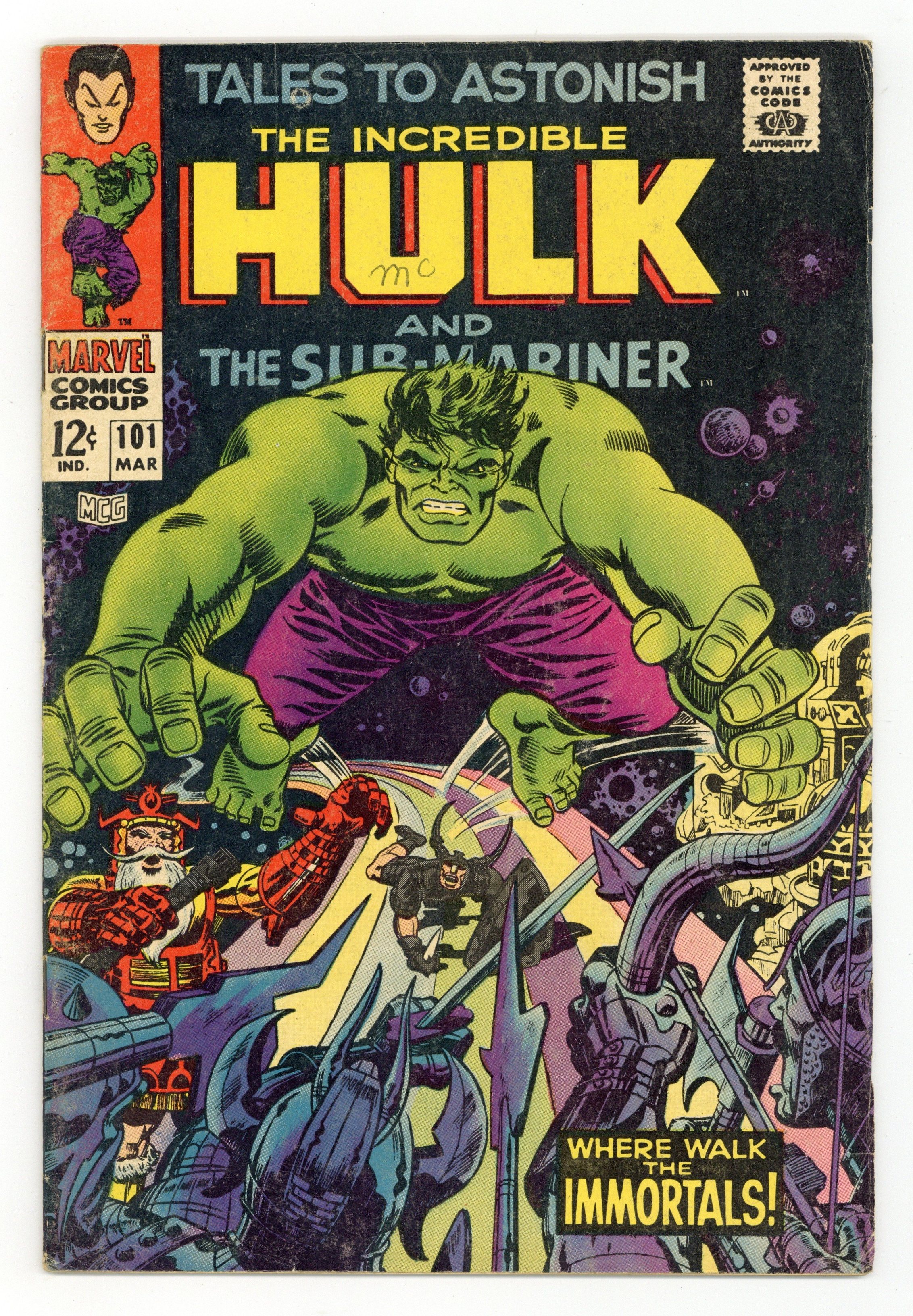 Cover by Marie Severin, Jack Kirby, Frank Giacoia, and Syd Shores. Where Walk the Immortals!, script by Stan Lee, art by Marie Severin and Frank Giacoia; Loki pulls the Hulk to Asgard to fight his father's forces; The Hulk battles the Warriors Three but in a moment of rare clarity, they discover that the jade giant is not really their enemy and refuse Loki's invitation to finish him off; Angered by his failure, Loki casts the Hulk into a bottomless pit. And Evil Shall Beckon, script by Archie Goodwin, art by Gene Colan and Dan Adkins; The Atlanteans abandon the second Atlantis; Namor goes to the Antarctic and finds Destiny hidden below the ice. 36 pgs., full color. The Hulk's solo adventures continue in the pages of Incredible Hulk (1962-1999 1st Series) #102. - Odinson, mycomicshop Archivist. Cover price $0.12.