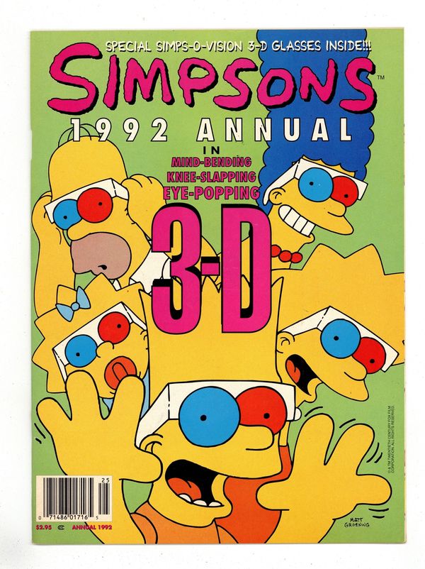 $3.30"Simpsons Illustrated" 1992 Annual in 3-D. Behind the Scenes with cast & crew, The Simpsons in "By the Barbecue's Red Glare", Bart's Dream House, and more. 6-1/2" x 9." Cover price $2.95.