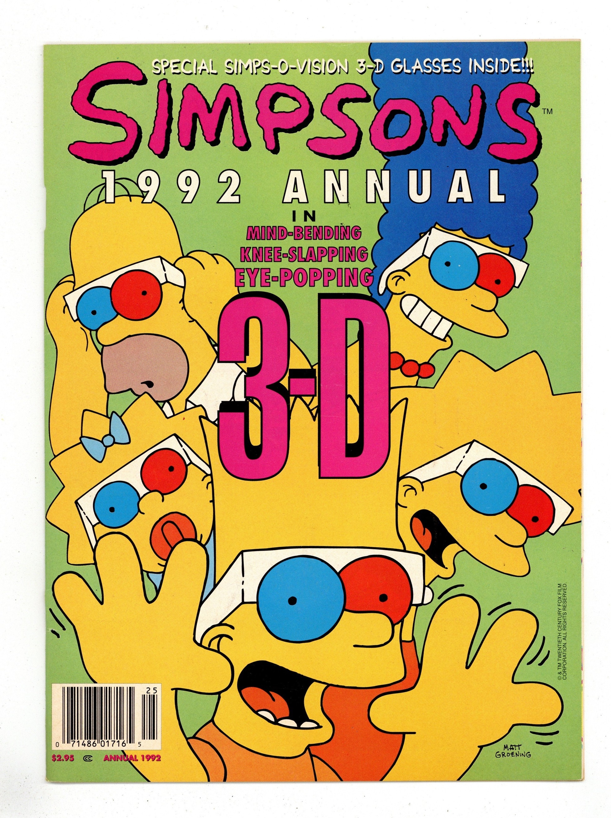 $4.50"Simpsons Illustrated" 1992 Annual in 3-D. Behind the Scenes with cast & crew, The Simpsons in "By the Barbecue's Red Glare", Bart's Dream House, and more. 6-1/2" x 9." Cover price $2.95.