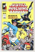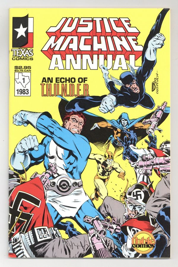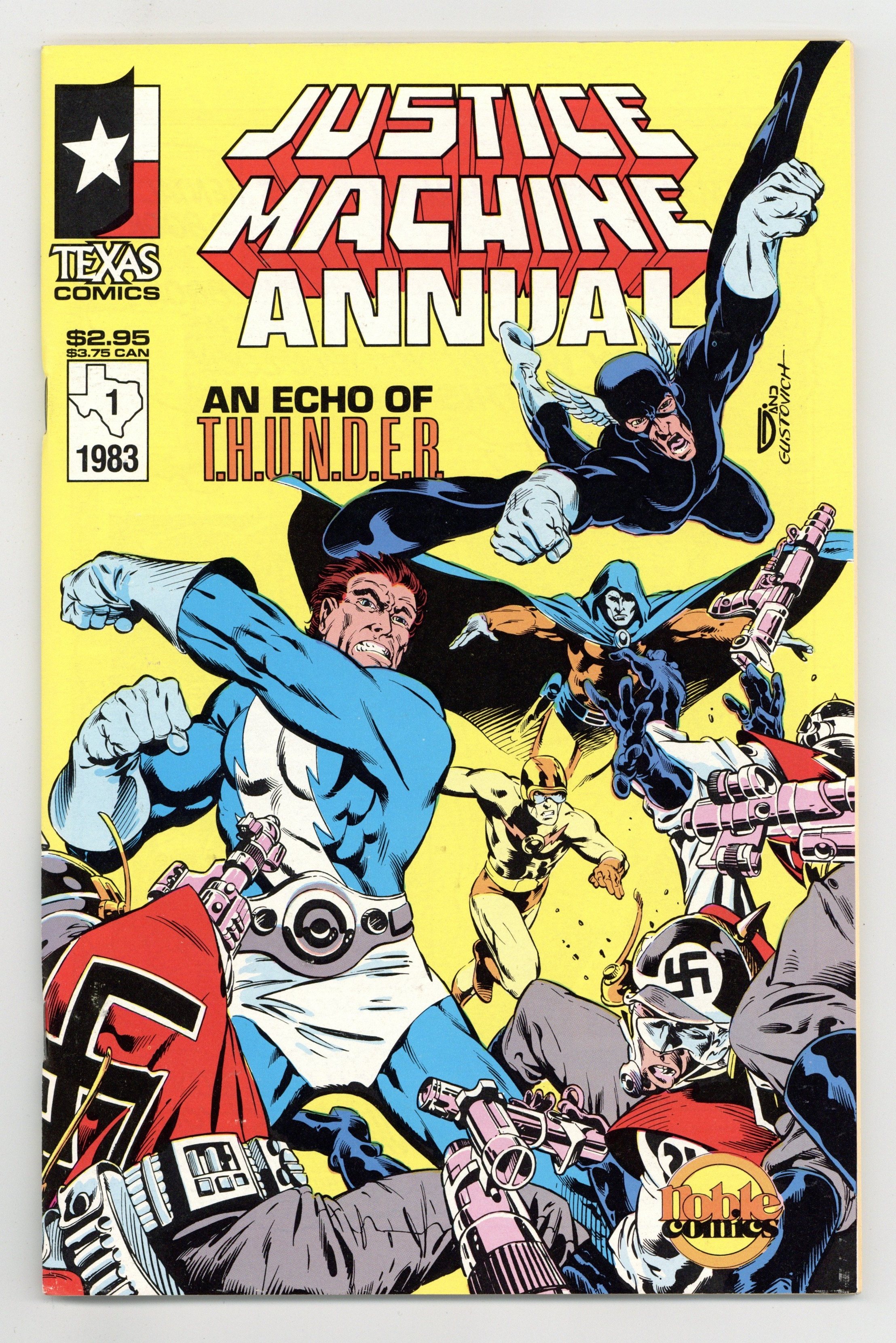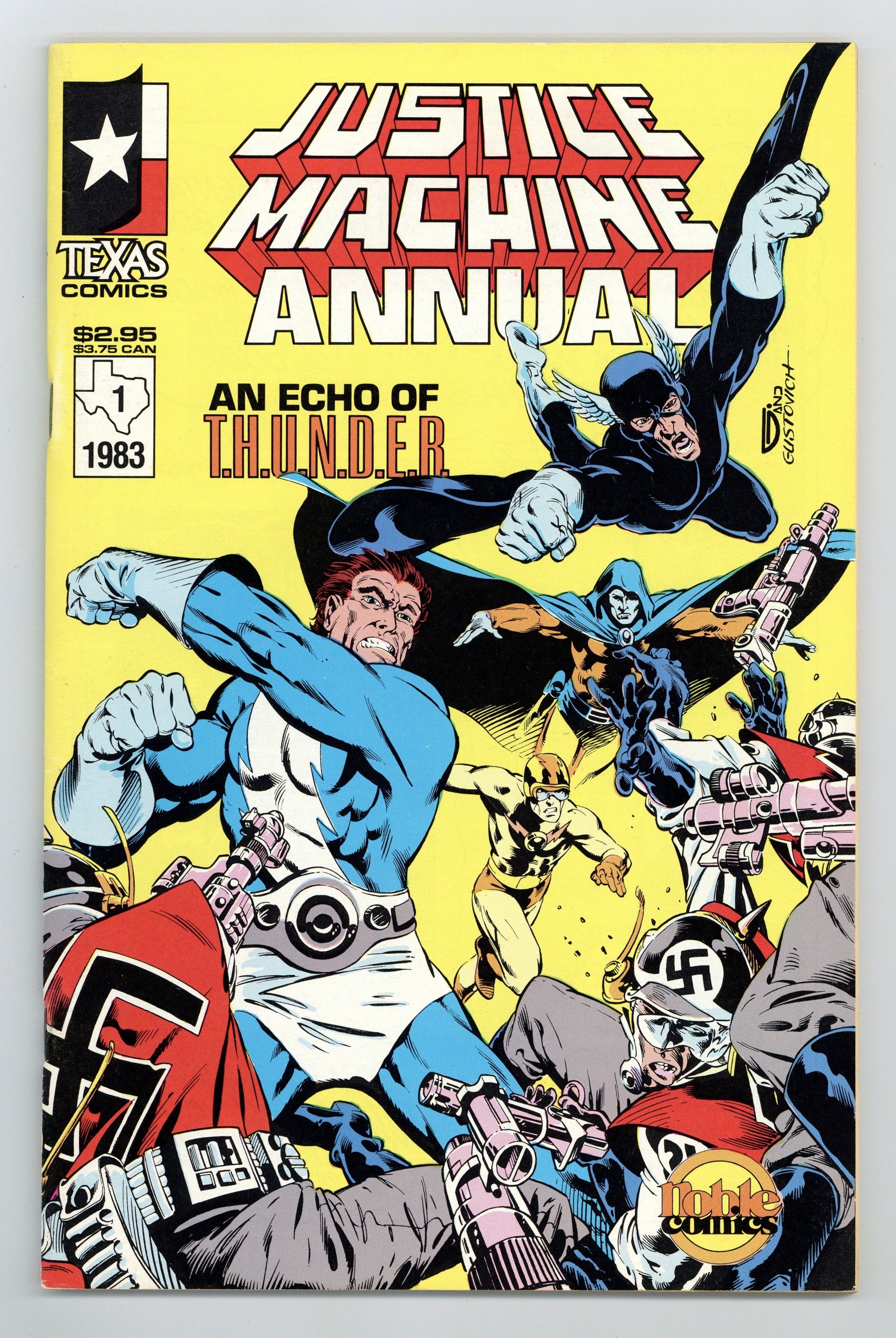 Published 1983 by Texas Comics.$11.00Wrap around cover by Mike Golden and Mike Gustovich. "An Echo of Thunder." 43 pages. Story by Bill Loebs. Pencils by Bill Reinhold. Inks by Jeff Dee and Bill Anderson. How about that, an annual where the title group doesn't even appear on the cover. Fortunately they are inside, where they team up with the Thunder Agents as they endeavor to stop the Nazi Von Geist from using his army of super soldiers to take over the United Nations. This story continues plot elements from the Noble comics Justice Machine series. Sub plots were to be continued in Texas Comics Justice Machine #1. This issue was never published, but the material was eventually published in 1990 as the Justice Machine Summer Spectacular by Innovation. "The shape of things to come." 20 pages. Story and pencils by Bill Willingham. Inks by Bill Anderson. 1st appearance of The Elementals. Shapeshifter is tasked by her employer to find out everything she can about the new group The Elementals. And what better way to determine their abilities than to attack them! 64 pages. Full color. Cover price $2.95.