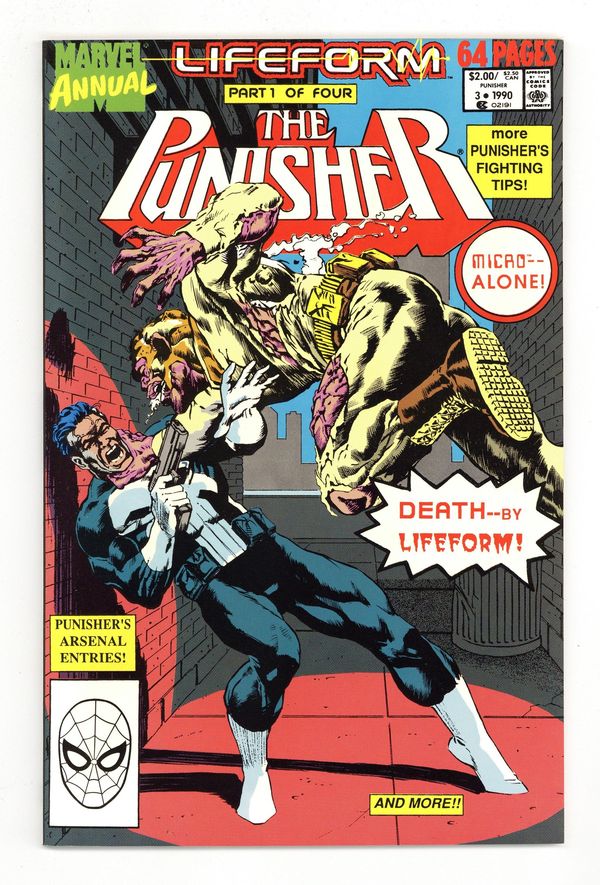 Lifeform: Part 1 of 4 - "The Progamma Strain!" Story by Mike Baron. Art by Neil Hansen. When Frank investigates a lead that AIM is producing biological weapons, he makes a horrifying discovery. Story continues in Daredevil Annual #6. Then in "Punisher's Fighting Techniques!" Story by Roger Salick. Art by Mark Texeira. Frank demonstrates why the Punisher is just a lethal unarmed as he is armed. Then in "Forewarned of Foretold?!" Story by Gregory Wright. Art by Lee Sullivan. The Punisher takes a tour through Hell and sees all the criminals he's sent there and realizes what is waiting for him when is war on crime is over. Finally, in "Philanthropy!" story by Mike Baron. Art by Mark Texiera and Dwayne Turner. Microchip takes on a conman that swindles people out of their life savings. 64 pages, FC. Cover price $2.00.