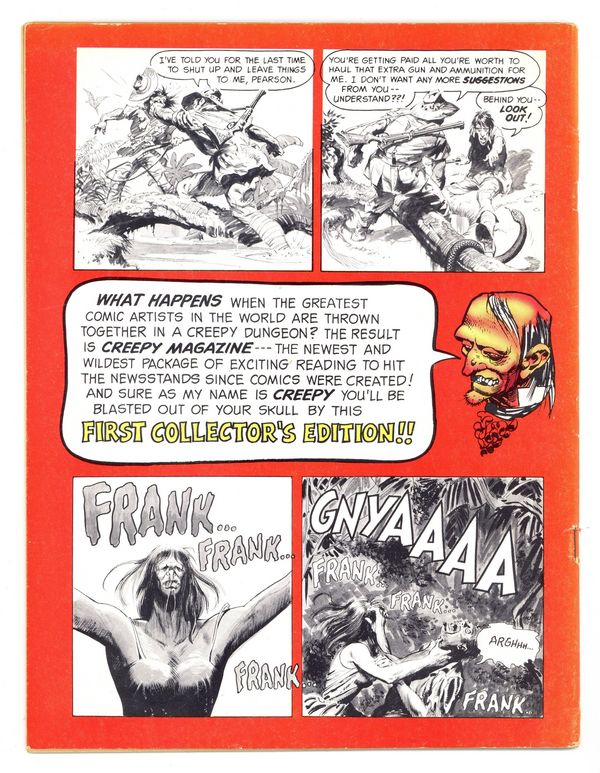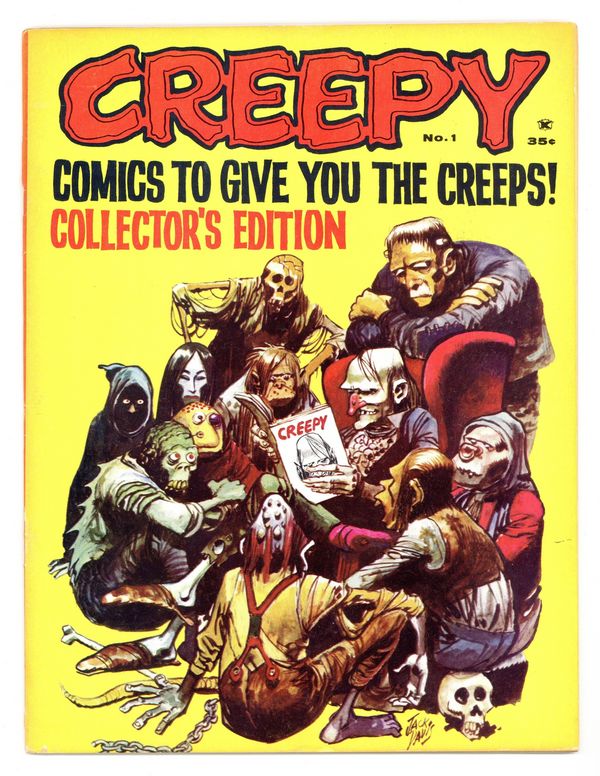 When the Comics Code Authority cracked down on the comic book industry in 1955, horror comics all but faded from the scene. Enter Creepy magazine, publisher James Warren's tribute (after a fashion) to EC's vaunted horror comics line, which couldn't survive the Code's strong arm censorship tactics. Magazines weren't subject to the same rules, giving Warren the freedom to publish more mature content. Eerie, Vampirella, and other Warren publications followed. Stories in this first issue of Creepy include: Voodoo by Bill Pearson and Joe Orlando; H2O World! by Larry Ivie, Al Williamson, and Roy G. Krenkel; Vampires fly at Dusk! by Archie Goodwin and Reed Crandall; Werewolf! by Larry Ivie and Frank Frazetta; Bewitched! by Larry Ivie and Gray Morrow; The Success Story by Archie Goodwin and Al Williamson; and Pursuit of the Vampire! by Archie Goodwin and Angelo Torres. Features the first appearance of Uncle Creepy. Cover art by Jack Davis. Cover price $0.35.