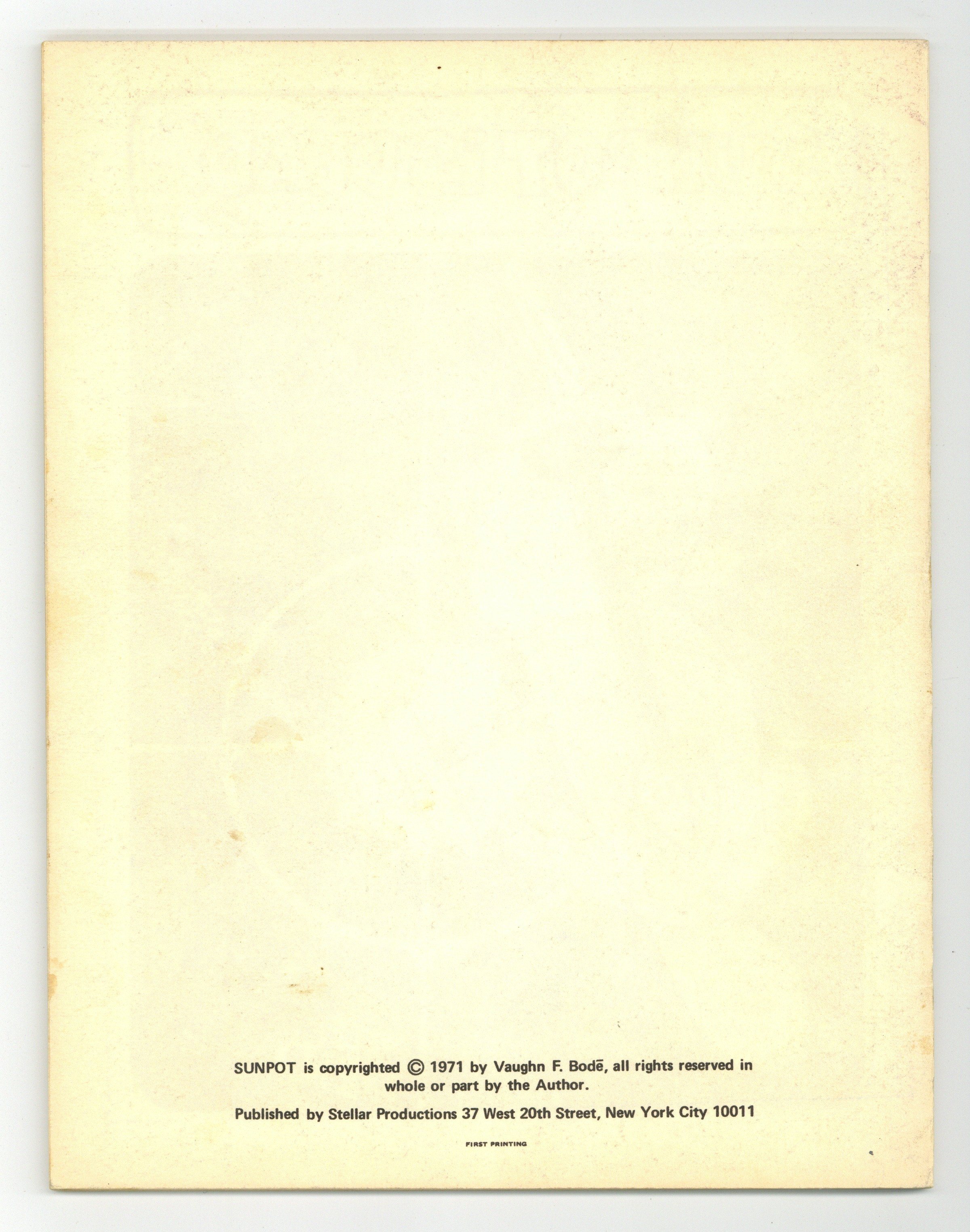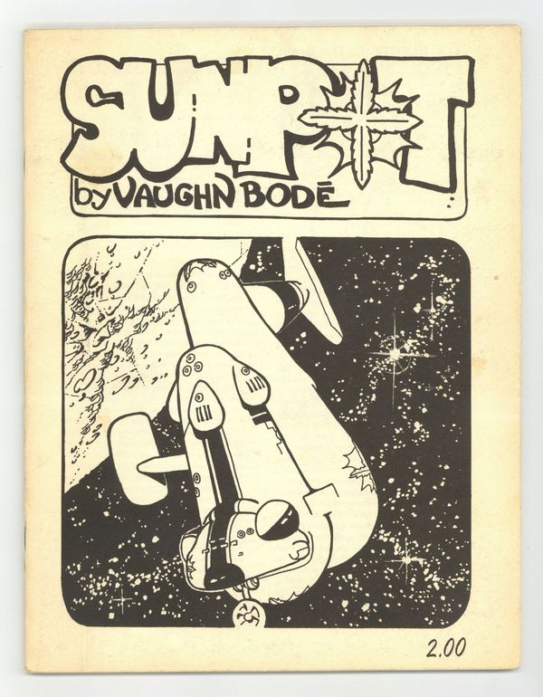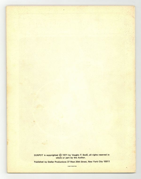 Vaughn Bode's plans and adventures of Sunpot. Unpaginated book of black and white illustrations by underground comic legend Vaugn Bode. Featuring the Sunspot vehicle, Belinda Bump, Electric Bee, Farkfoot and other creations. Includes blue schematic poster of the ship. $2.00 cover price, 32pgs, B&W. Cover price $2.00.