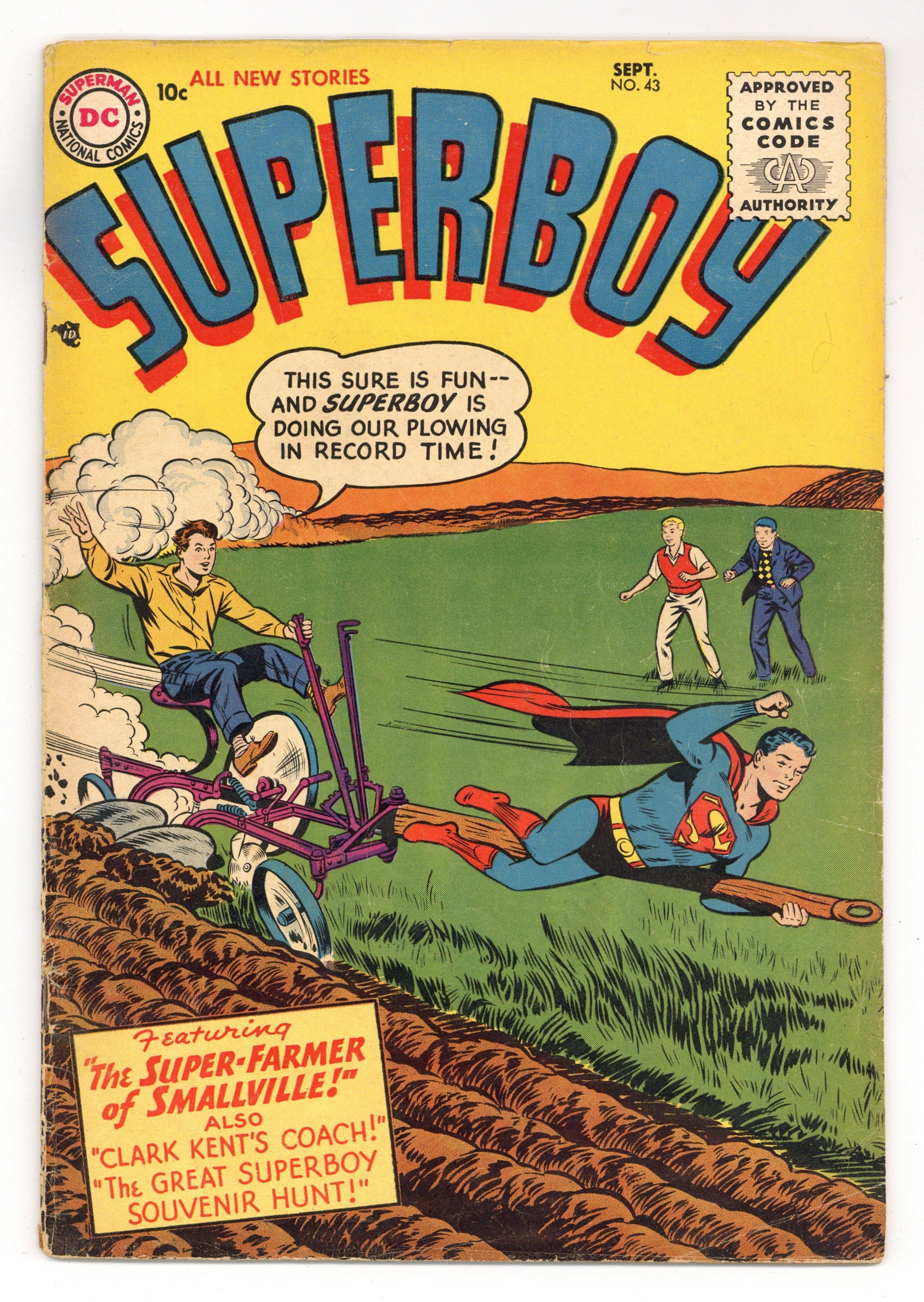 Cover pencils by Curt Swan, inks by Stan Kaye. "The Great Superboy Souvenir Hunt," script by Otto Binder, art by John Sikela; Souvenir hunters after mementos of Superboy's deeds cause problems for the Boy of Steel. Shorty humor half-page by Henry Boltinoff. "The Super-Farmer of Smallville," script by Otto Binder, pencils by Curt Swan, inks by George Klein; A farmer secretly torches his own barn and blackmails several boys into working on his farm to make up for it, but Superboy intervenes to teach him a lesson. Peg humor page by Henry Boltinoff. Know Your Reptiles article by Jack Miller. "Clark Kent's Coach," script by Otto Binder, art by John Sikela; Lana asks Superboy to help Clark become more brave. 36 Pages, Full Color. Cover price $0.10.