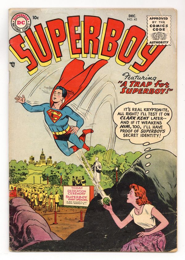 Cover pencils by Curt Swan, inks by Stan Kaye. Incredible Superboy Auction, art by John Sikela; After the General Store burns down, Pa must raise money and accidentally auctions off all of Clark's Superboy souvenirs. Bat Kite --Superboy's Workshop activity page. The Secret of the Super Charades, script by Otto Binder, art by John Sikela. Varsity Vic humor page by Henry Boltinoff. The Man Who Owned a Volcano text story by Jack Miller. A Trap for Superboy!, art by John Sikela; Lana Lang stumbles on a piece of kryptonite and tries to prove Clark is Superboy. How a Nation Is Born public service announcement, script by Jack Schiff, inks by Win Mortimer. 36 Pages, Full Color. Cover price $0.10.