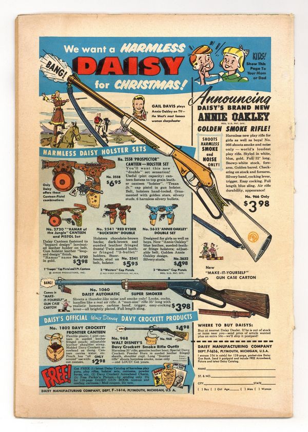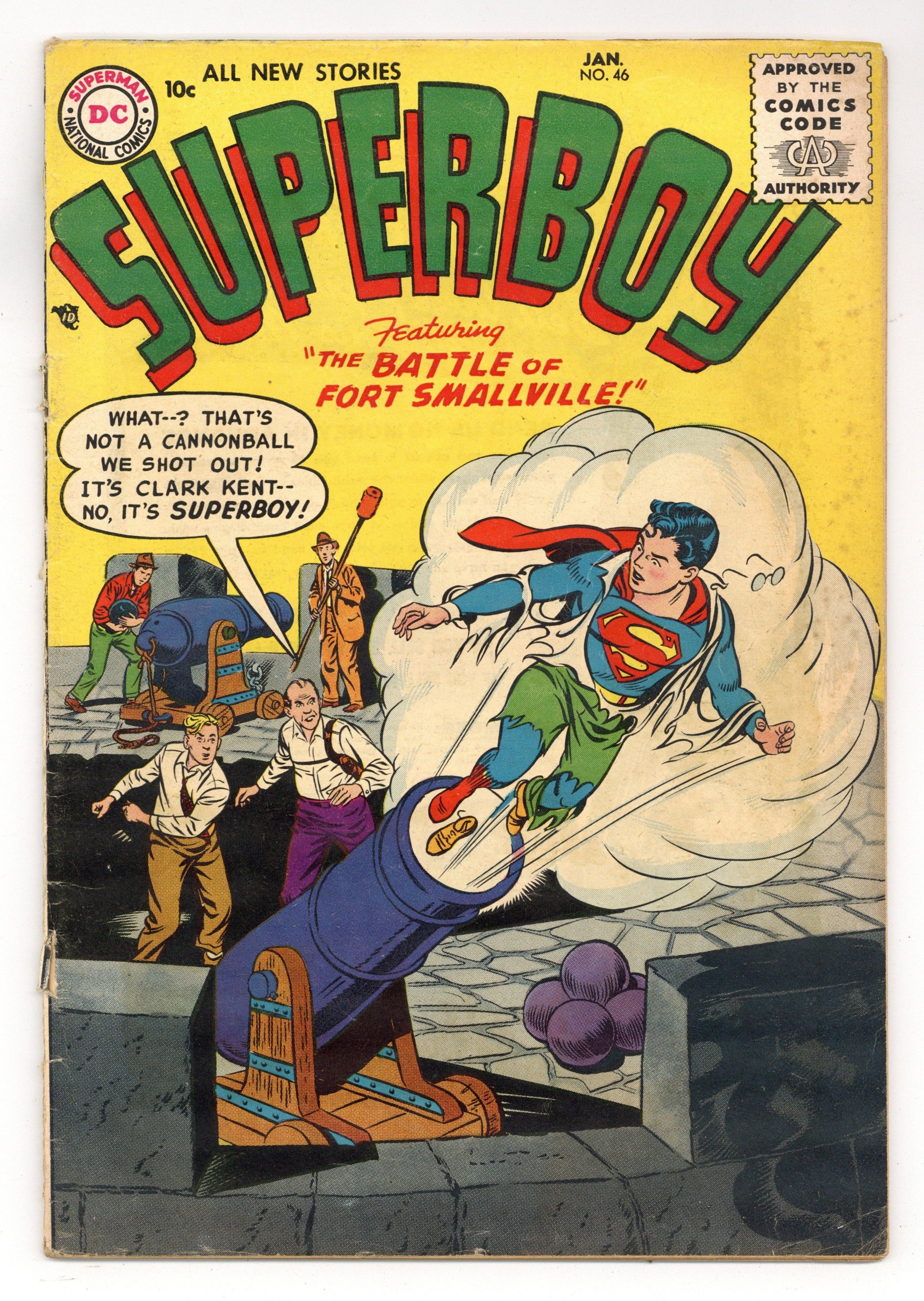 Cover pencils by Curt Swan, inks by Stan Kaye. The Boy Wizard, script by Otto Binder, art by John Sikela; A clash with a comet temporarily takes away Superboy's telescopic vision and super hearing. The Silliest Jobs in the World, script by Otto Binder, art by John Sikela; When Prof. Lang is injured in an accident, Superboy offers to help him around the house. The Best Present of All! public service announcement starring Binky, script by Jack Schiff, art by Bob Oksner. Bulldozers Blitz the Blazes text article by O A Fitzgerald. Shorty humor page by Henry Boltinoff. The Battle of Fort Smallville, art by John Sikela; Superboy reconstructs Fort Smallville, an old Fort that the town was built over. Varsity Vic humor page by Henry Boltinoff. 36 Pages, Full Color. Cover price $0.10.