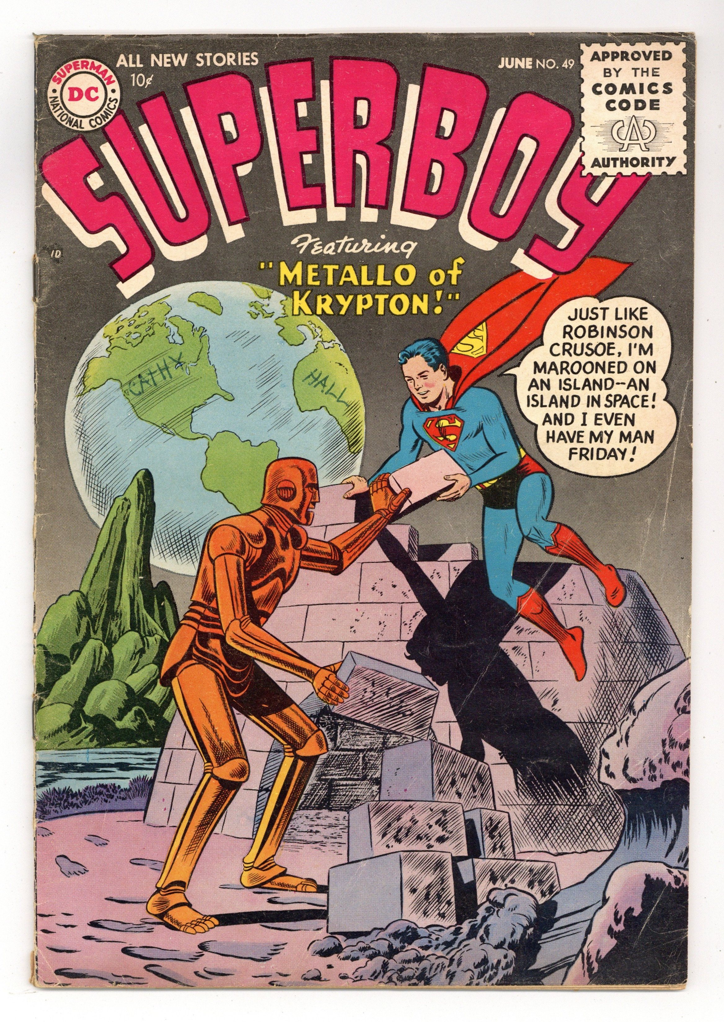 Tags: Superman$150.00Cover pencils by Curt Swan, inks by Stan Kaye. The Loneliest Boy in Town starring Superboy, script by Otto Binder, art by John Sikela; Freddy Parker is ashamed of his father because he's just a doorman. Peg humor page by Henry Boltinoff. Lana Lang's Secret Identity, script by Jerry Coleman, art by John Sikela; When Lana wins a contest and tries to remain anonymous, Clark turns the tables on her and tries to prove she is Miss Glow. Shooting the Stars text article by Jack Miller [as James MacKay]. Metallo of Krypton, script by Jerry Coleman, art by John Sikela; Superboy is trapped on an asteroid by kryptonite dust and discovers a robot there that was built on Krypton. 36 Pages, Full Color. Cover price $0.10.